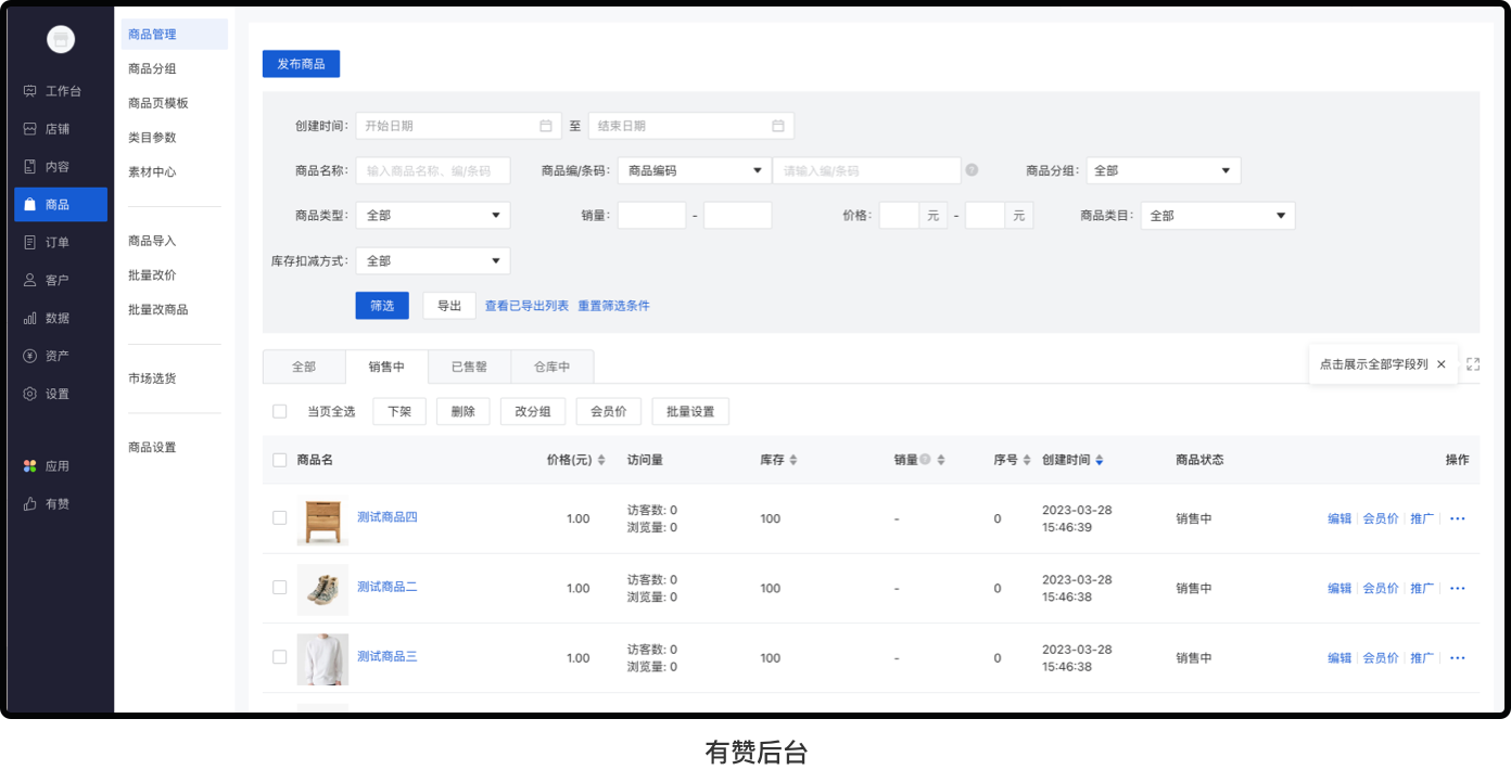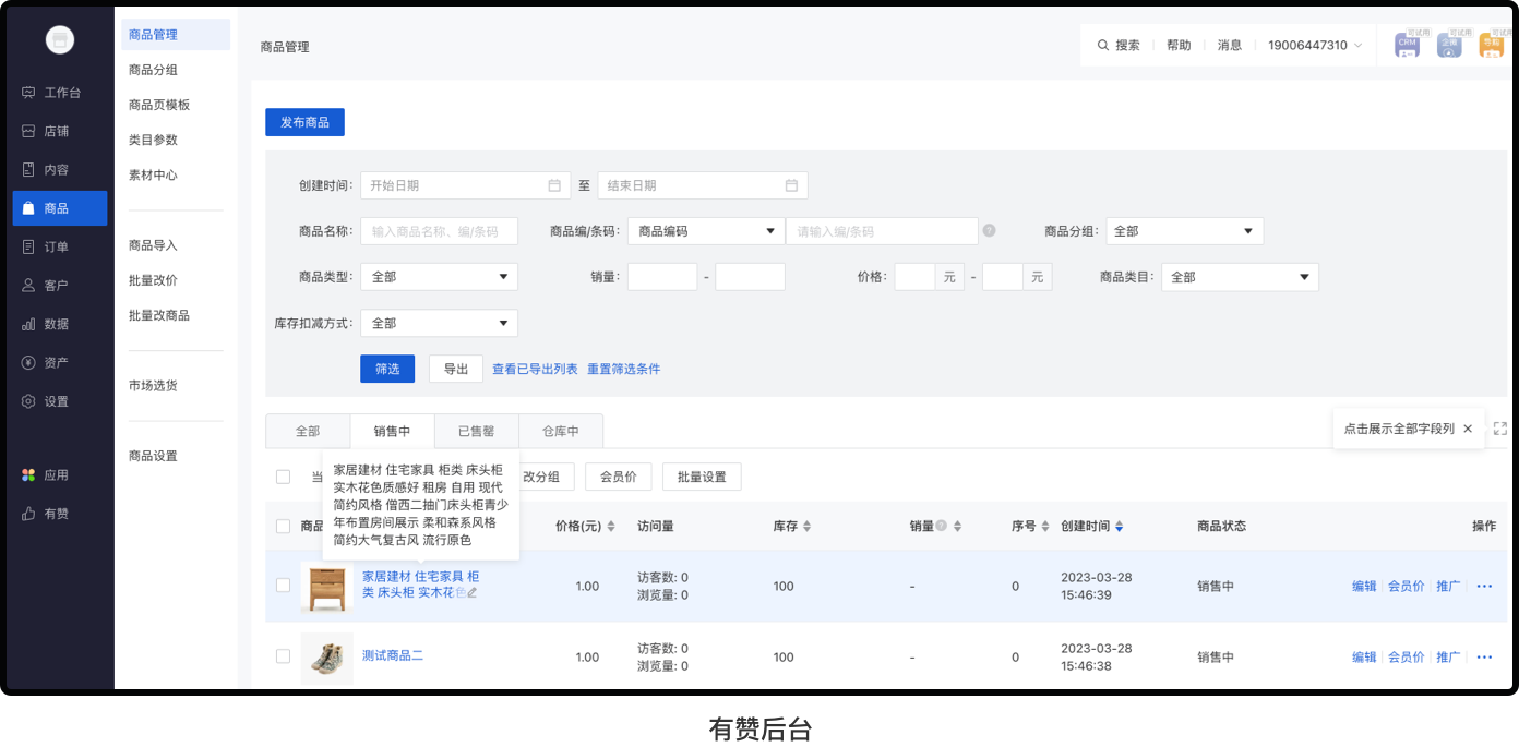 依旧举例有赞后台,商品模块,商品名称文字没有限制字数,商家填写关键词较长,文本数据较多,这里采用的是固定文字宽度,超过部分...展示,鼠标移上去则展示全部的文字。