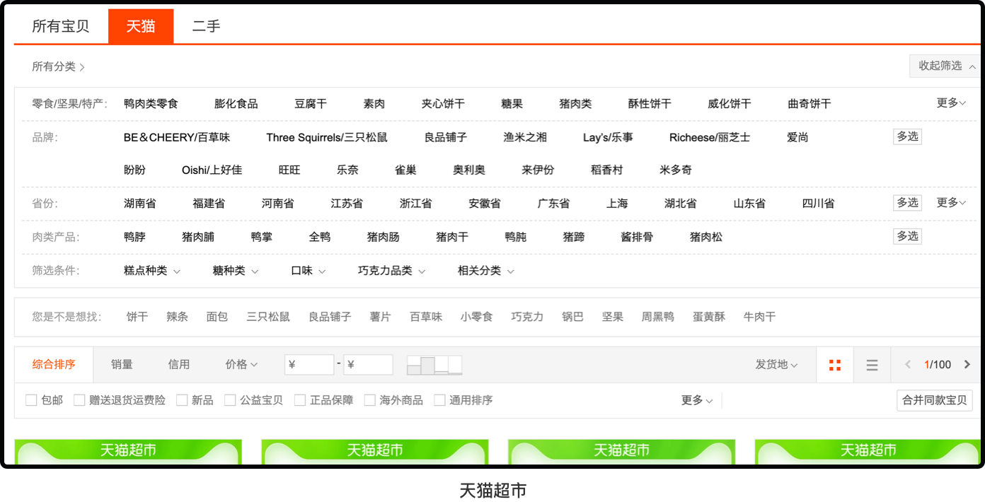 天猫后台这里就是采用了平铺筛选,在商品种类,品牌多的情况下,平铺筛选减少了页面展示使用面积,让用户能看到更多的选项, 虽然内容较多,但是这里也经过了控制,把点击率较高的品牌与分类前置展示,更多的其他内容则收起,用户需要再自行点击放出来。
