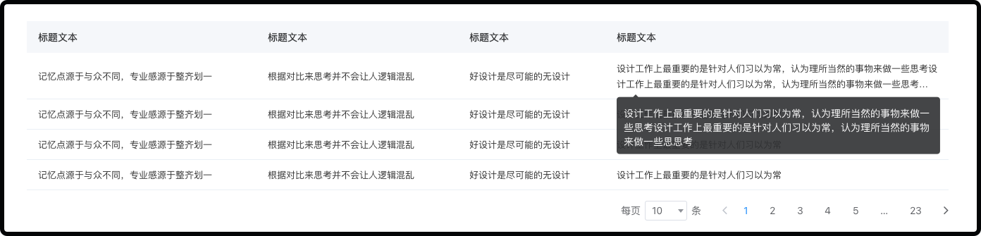 1. 定义一个单元格长度或字数限制,超过该范围以"..."显示,鼠标悬停时出现气泡显示完整内容。