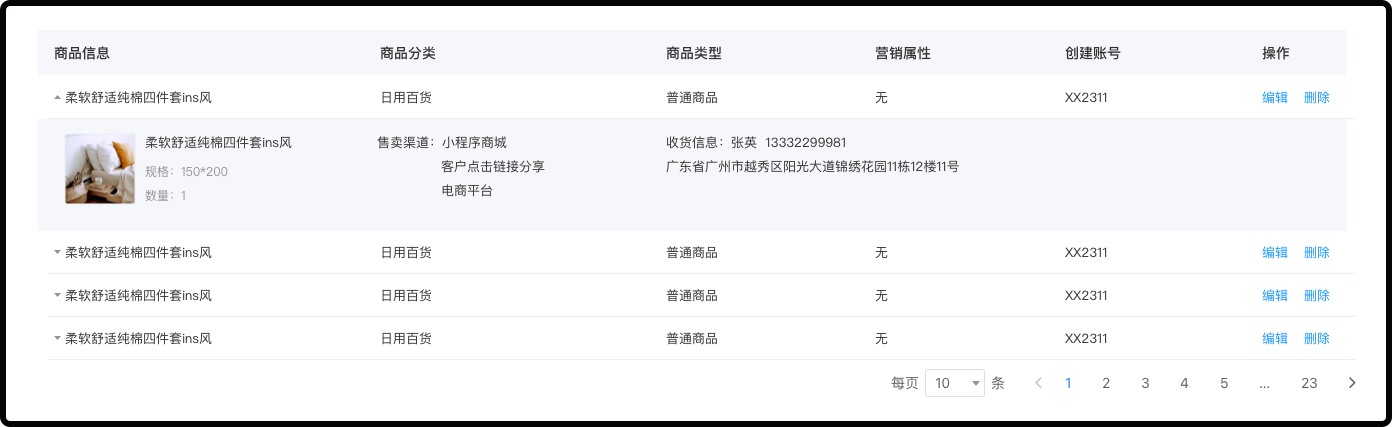 还有一种情况则是需要直接在表格里展开(可以是详情,也可以是二级表格),无需打开新页面即可查看附加信息,防止用户迷失,这种方式适用于信息较少的情况下。