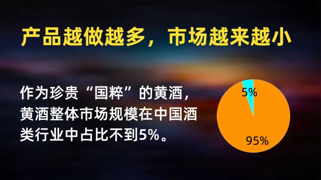 黄酒是世界上最古老的酒类之一,源于中国,且唯中国有之,是中华民族之瑰宝。但是随着白酒市场的规范化、葡萄酒市场的快速发展,黄酒整体市场规模在中国酒类行业中占比不到5%。结果就是产品越做越多,市场越来越小。