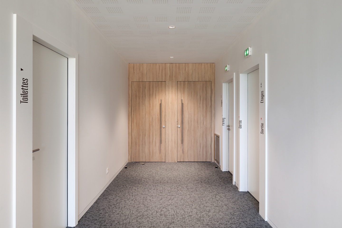 考虑到建筑的空间和动线设计,标牌以狭窄的特征呈现,信息被置于门框边缘,使得空间不会显得拥挤。采用红色、白色和黑色的配色,信息在简约的空间中易于辨识。纤长的无衬线字体搭配线性icon,整套导视系统与建筑语言相呼应。