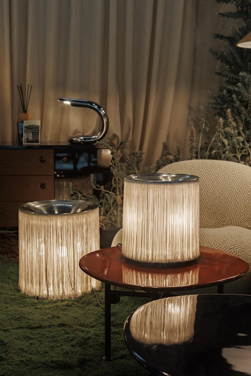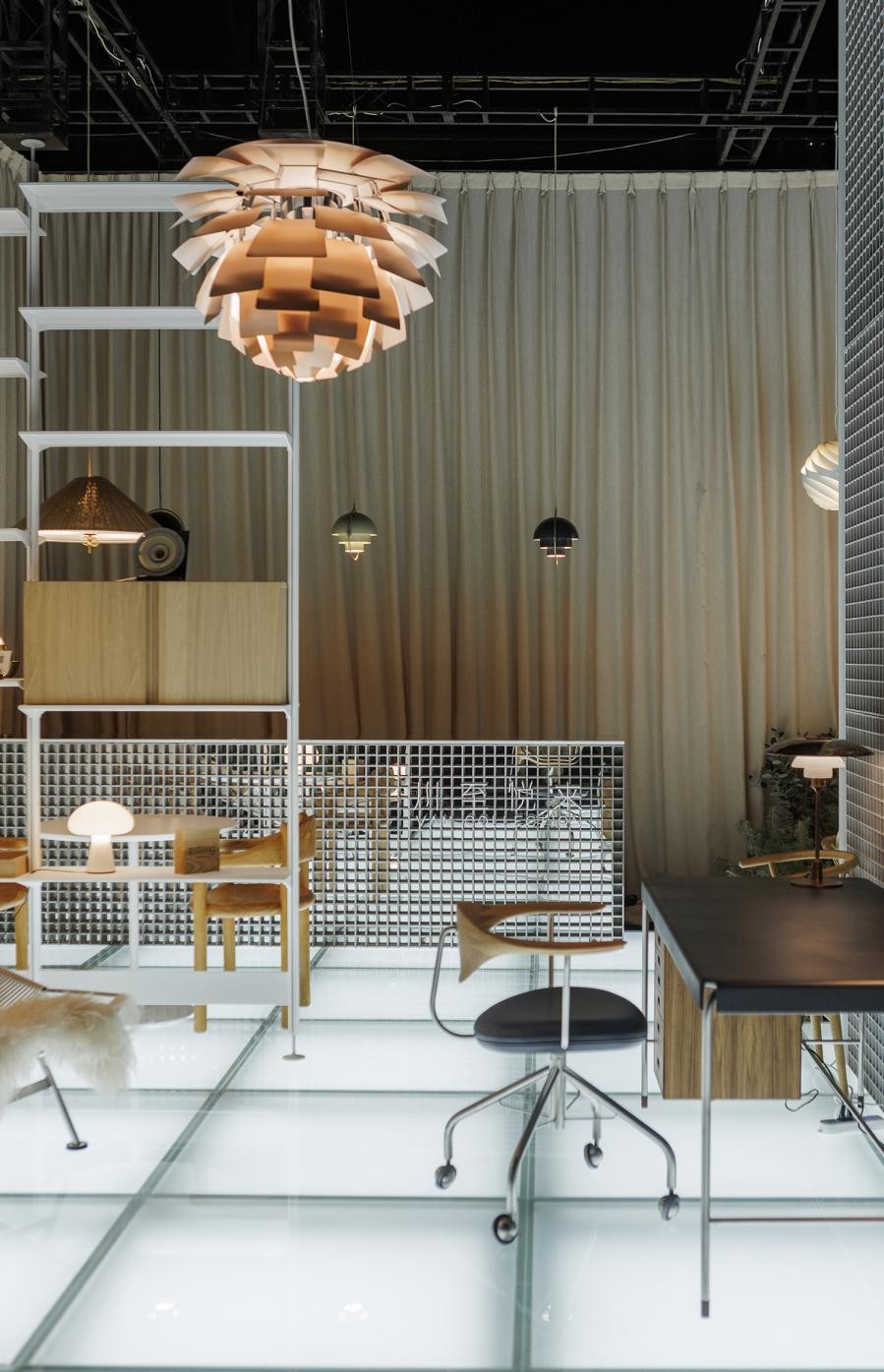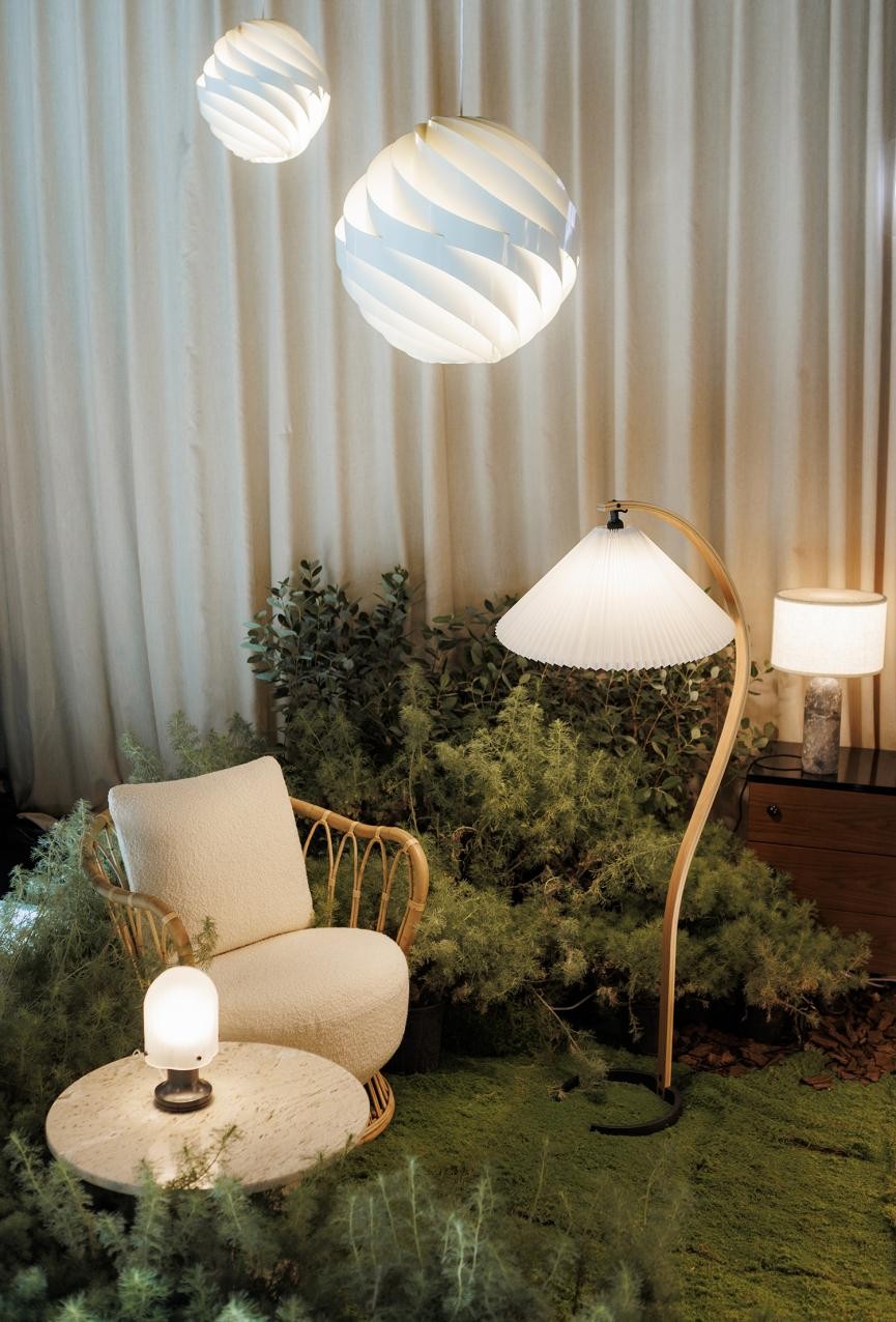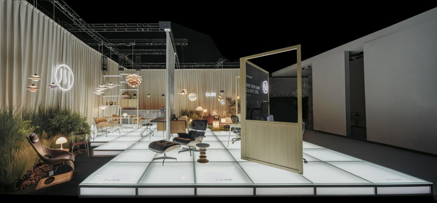 此次川至悦来沿用两年前在设计上海首次亮相的可循环使用装置——光之展台,在家居陈列上重新布局。整个展位,分为“日常”和“非日常”的两个区域,在发光展台上搭建的是餐厅、书房、游戏室等功能区域,两侧则用植物和艺术性家具来造景,营造一种非日常的休闲度假氛围。尤其是为GUBI品牌搭建的花园,完整地呈现出了品牌“轻奢、浪漫”的DNA, 成为展会网红打卡热点。