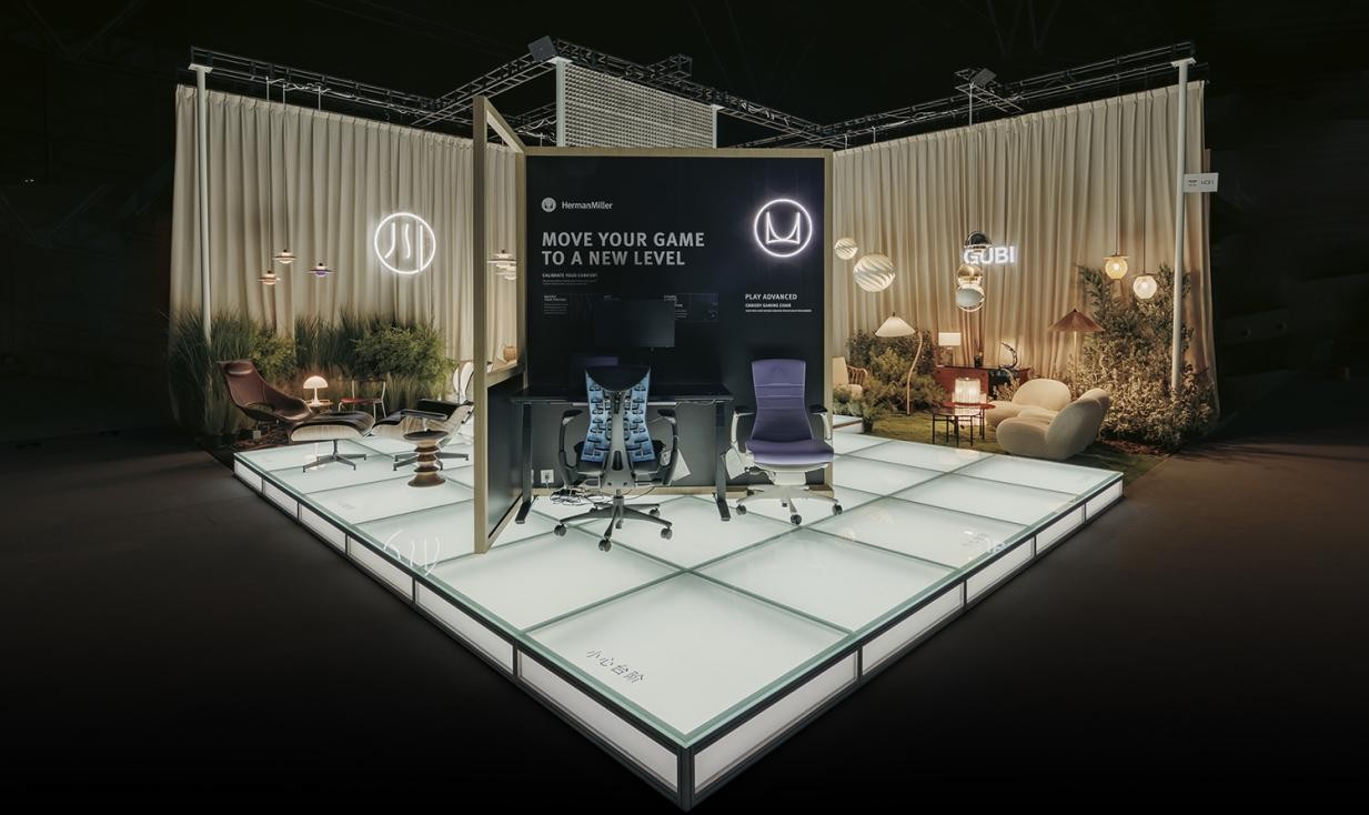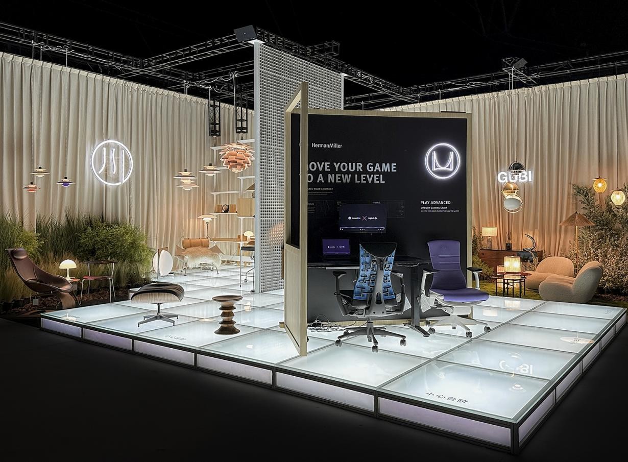 川至悦来的光之展台由意大利屡获大奖的设计师Alberto Caiola在2021年为Herman Miller和川至悦来联合打造,展台设计采用了颠覆性的照明理念,取代了传统意义上从上⽅进⾏聚光照明的⽅式,改为由家具下⽅,通过发光的地砖进⾏照亮,意寓着疫情之后不同的思考视角。观展者脚下的灯光赋予了展位超凡脱俗的感官品质,营造出⾮凡的观展体验。