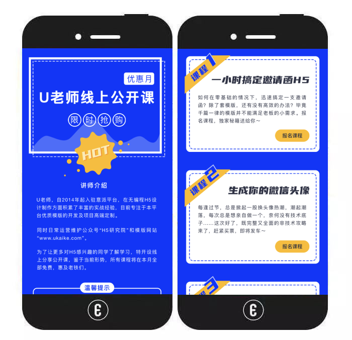 玩法介绍:该模板主要以长页面的形式呈现讲师介绍及各种课程信息。用户看到心仪的课程后,可根据提示在线报名,并获得一份带有自己微信头像的听课证海报。