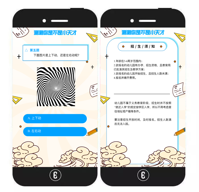 玩法介绍:该模板包含5道趣味测试题,答题完毕后,用户可查看测试结果及幼儿园介绍、园区环境照、师资力量、招生须知等信息。信息浏览完毕后,用户还可开启一键导航、完成在线报名(输入名字、电话、年龄、性别并提交)。同类型模板还有:《学校招生幼儿园招生答题测试》《学校托管班招生答题测试》《答题测试学校招生》