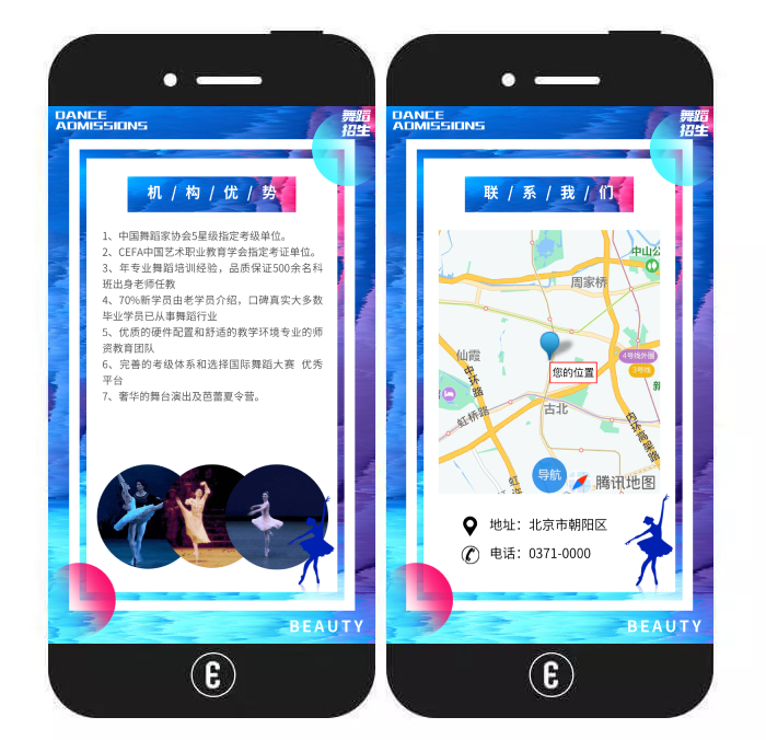 玩法介绍:该模板主要以图文结合的方式介绍机构的优势、环境、课程、师资、收费标准、联系方式等信息,用户查看完毕后,可一键开启导航,或进行在线报名。
