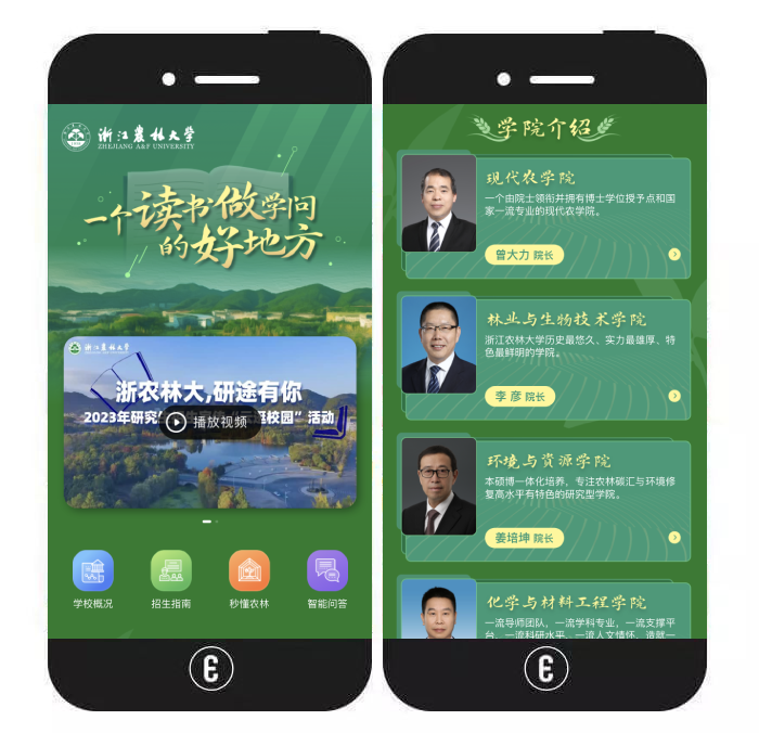 内容简介:该H5主要以长页面的形式将学校方方面面的介绍,及研究生招生信息有序排列。用户可先查看学校宣传视频,再通过4个按钮分别进入不同的板块:①【学校概况】包含学科建设、师资力量等信息;②【招生指南】包含招生简章、专业目录等信息;③【秒懂农林】包含5段宣传视频;④【智能问答】常见问题在线咨询。此外,用户还可查看各个学院的介绍(视频+文字)、研招宣讲视频、学院风采照及师资队伍文字详解。