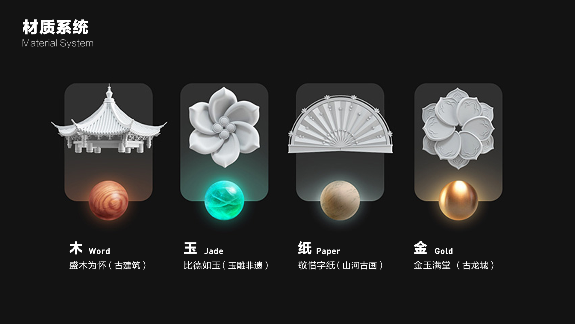 (1)“中国质”- 神:我们选取代表中国传统文化的质感“木”、“玉”、“纸”、“金”,以新兴渲染技术和现代视觉表现手法,将中华传统的内在神韵显性展现。