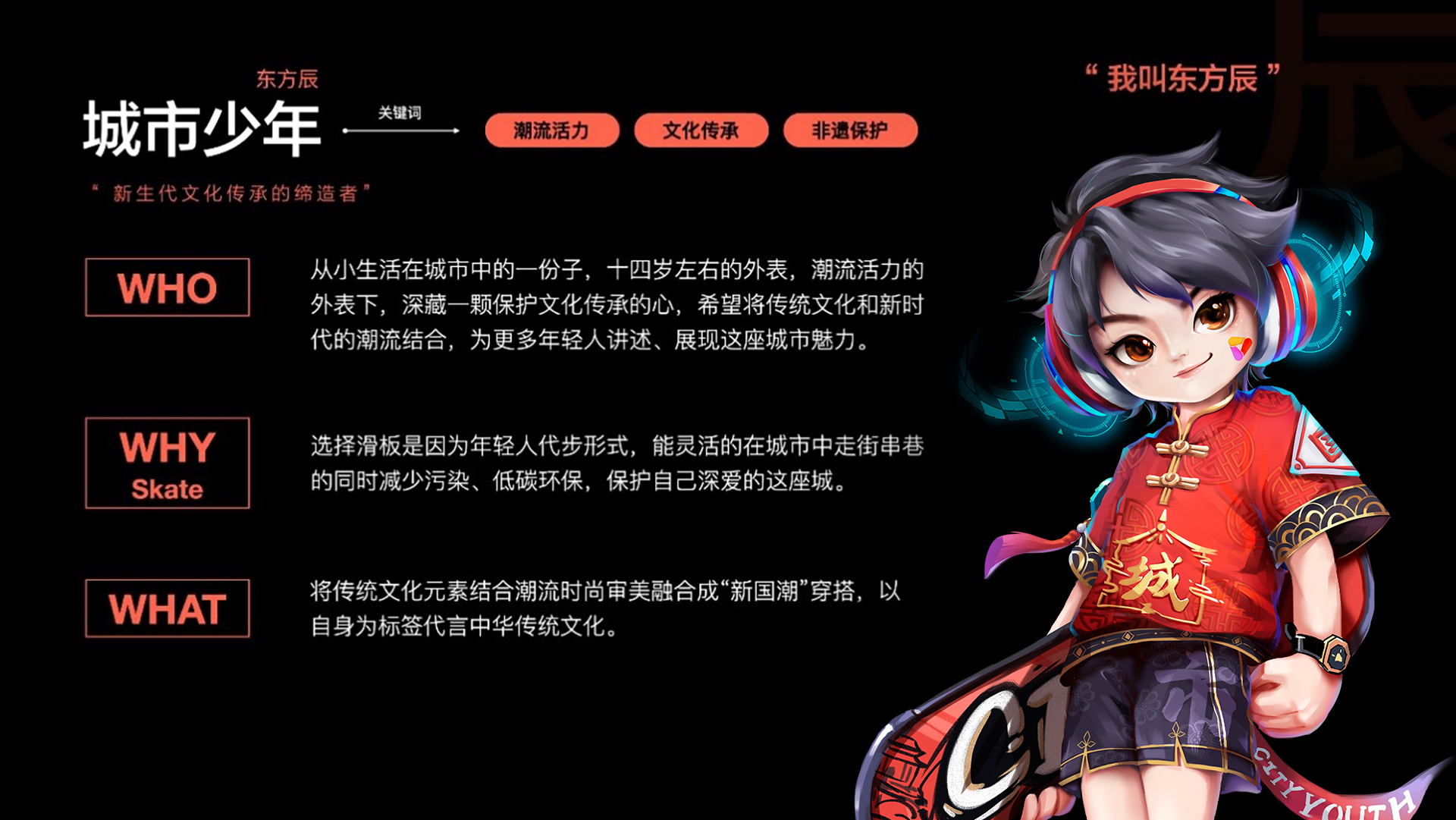 年轻人探索未知、充满好奇,及对潮流文化追逐的性格映射,造就了具有中华优秀传统文化创造者、传承者精神价值的人格化IP形象城市少年-东方辰。