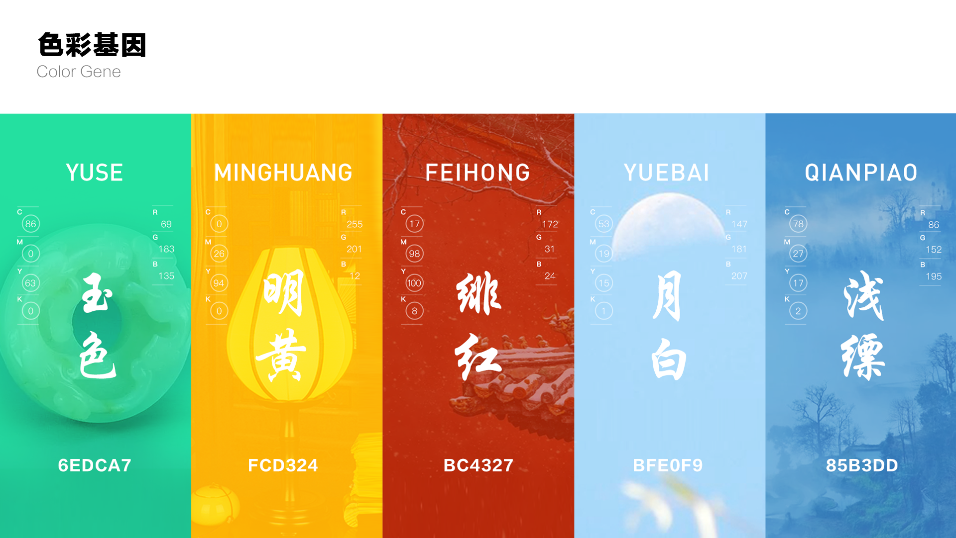 (2)颜色系统 -“中国色”:中国色不止于色,有传承千年的语境和独特之处,我们选自代表天地的“浅缥”和“月白”,代表建筑的“绯红”,代表信念的“明黄”色,展现中国色彩美学。