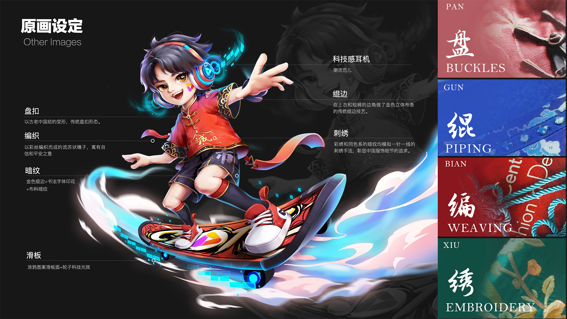 在东方辰的穿搭设计上我们将传统文化元素进行解构,通过3D模拟中国传统的盘扣、绲边、编织、刺绣、传承匠人匠心的传统技艺,同时融入最新的时尚趋势及年轻人的审美,以自身为标签代言中华传统文化。