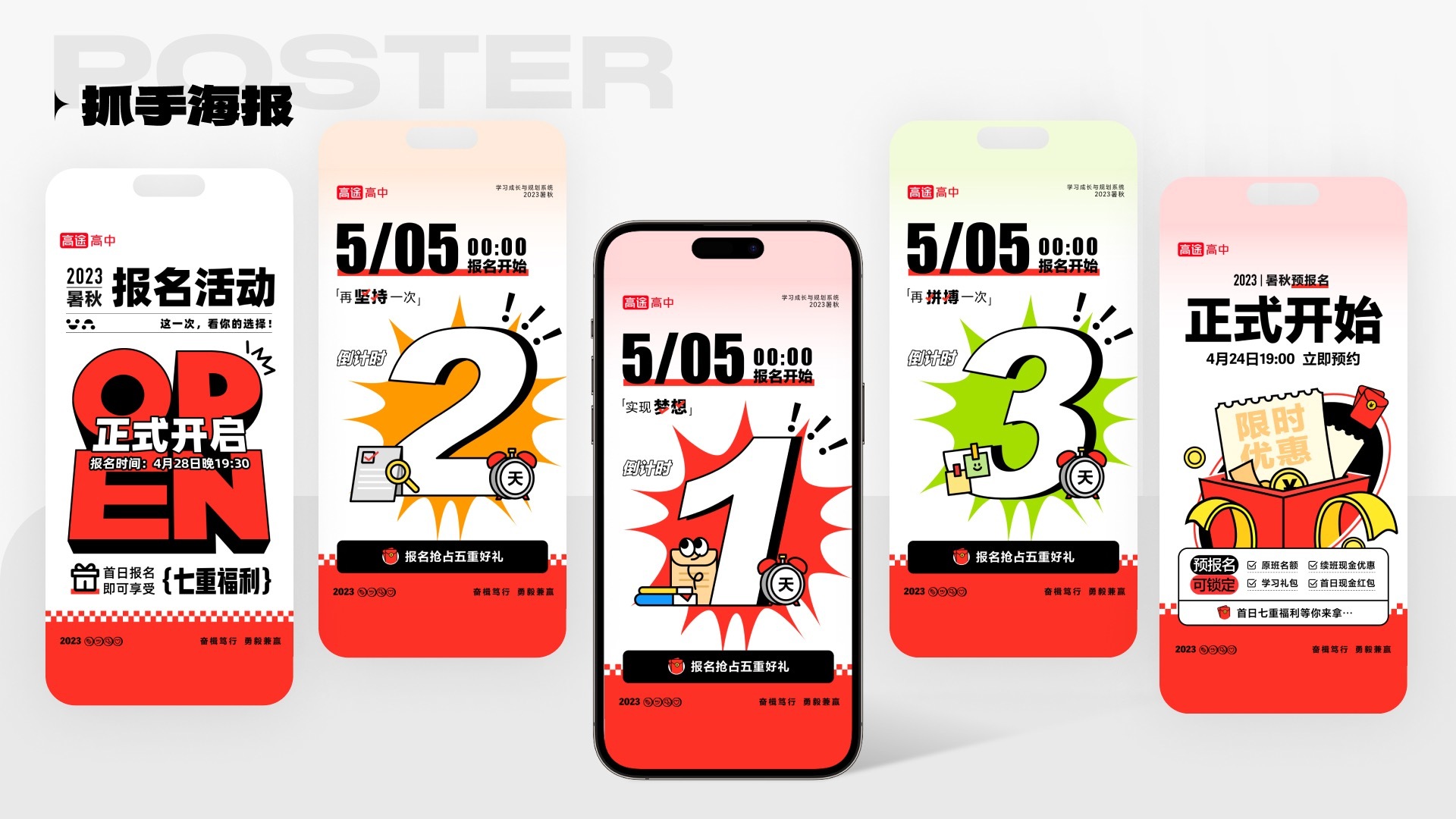 经过多轮尝试、打磨和细化,最终完成高途高中学习场景下的视觉方案,通过在APP、官网、课件讲义及周边文创等的应用,组合曝光,不断覆盖和传递年轻化、有自我映射和共情的心流设计,增加辨识度占领用户心智。