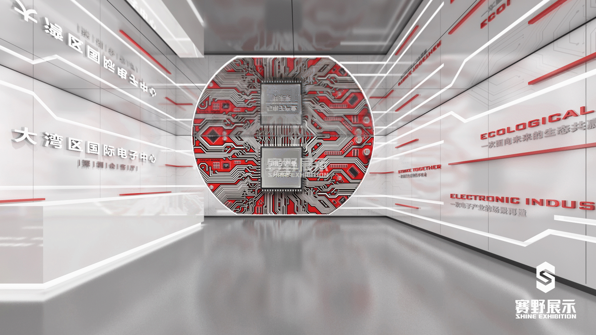 展厅共分为五大展区,分别为——“序厅”、“共情厅”、“共识厅”、“共鸣厅”与“共赢厅”。场景创意写实般打造了一次电子产业的场景再造、一次剑指全球的携手出击、一次面向未来的生态共赢。