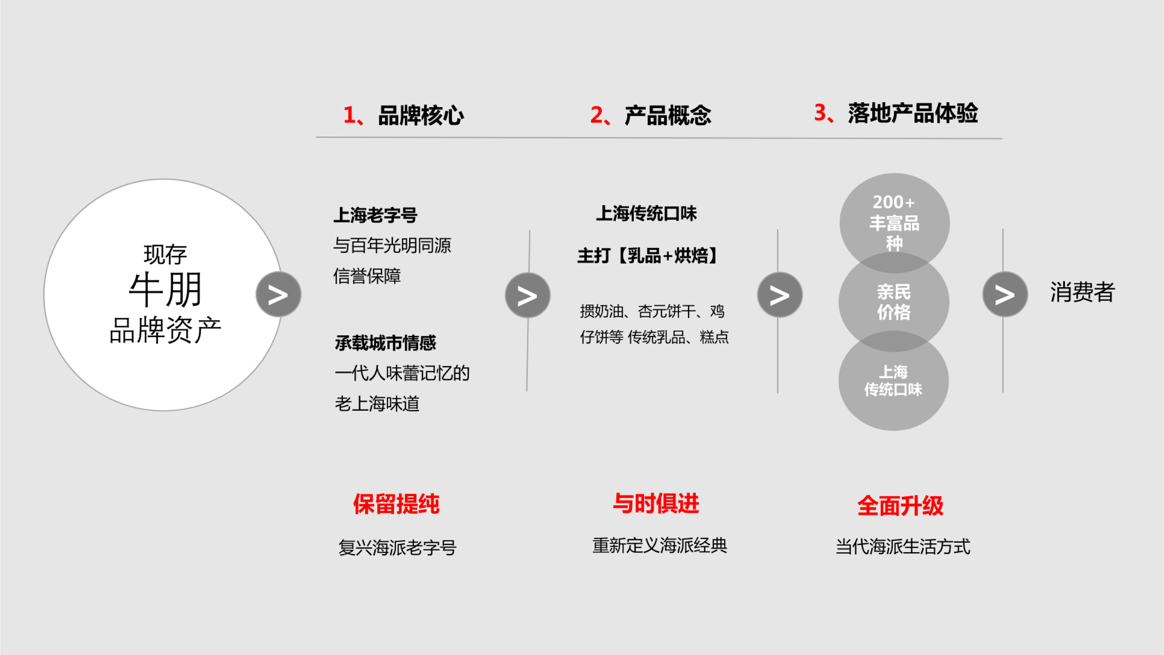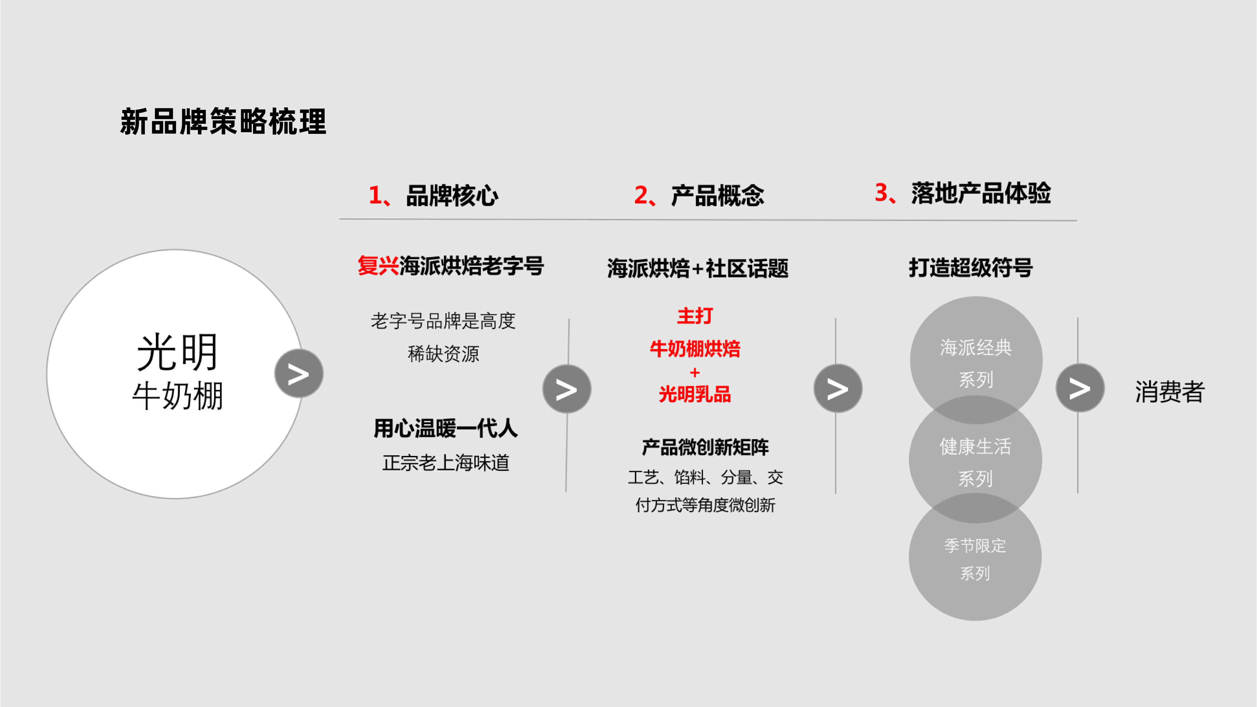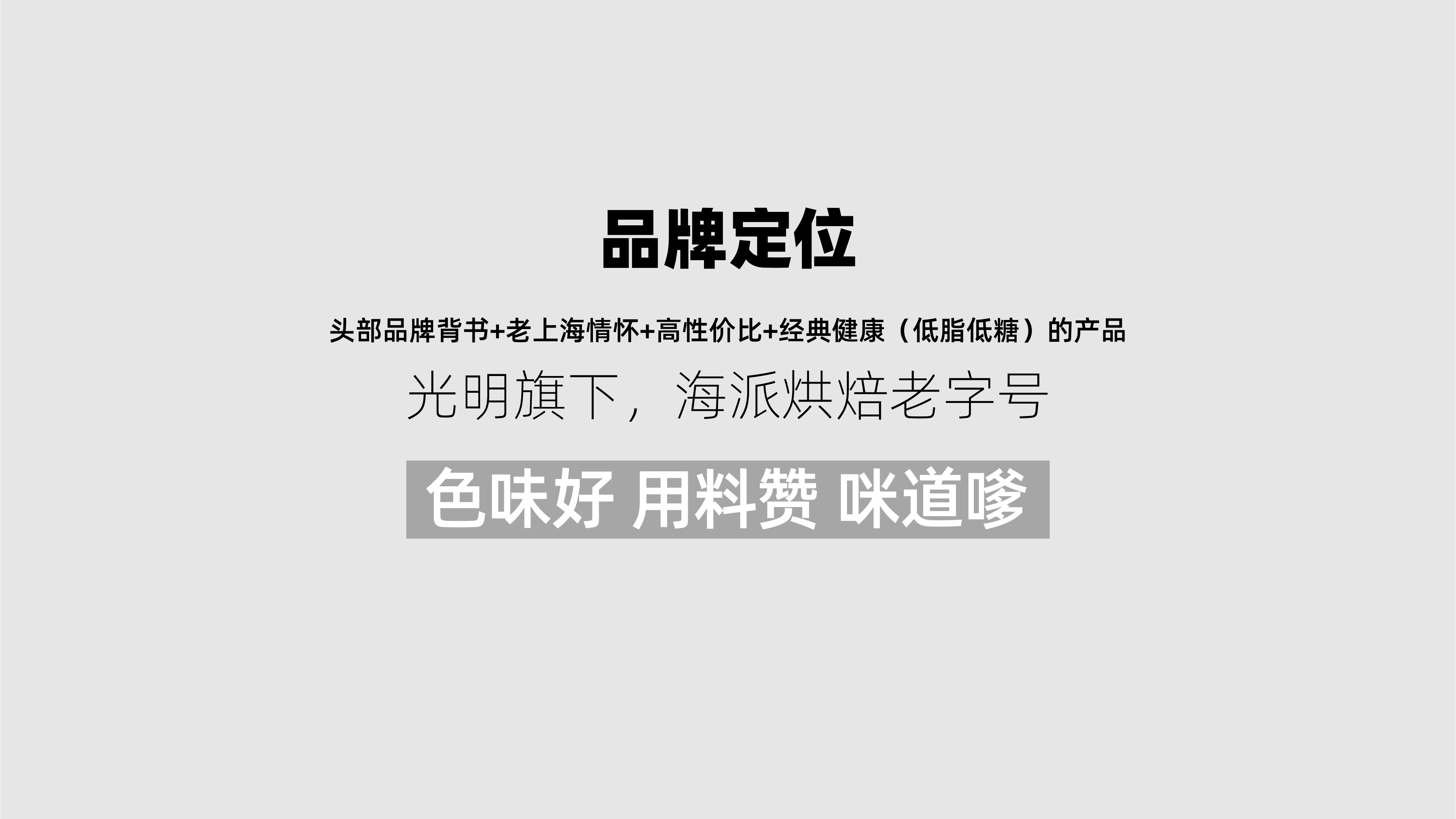 本次光明牛奶棚品牌升级方案,我们将品牌定位在“光明旗下,海派烘焙老字号”的概念下,主打老上海情怀、高性价比、经典健康的产品,在宣传语上则使用更具人文关怀的话术,“用心温暖生活”;