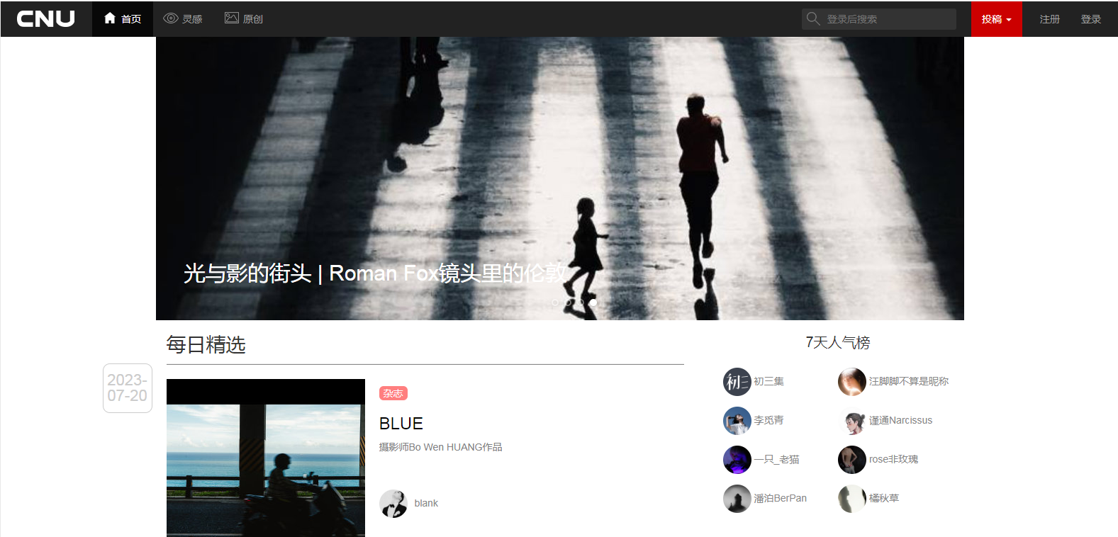 网站一直以高质量、高标准为宗旨,打造业内最顶尖的视觉交流平台。目前汇集众多顶尖的视觉艺术家,希望通过凝聚社群的力量,传播优秀视觉文化,开拓大众审美视野。网站活跃度高,作品质量也很棒,非常适合摄影师拍摄学习。