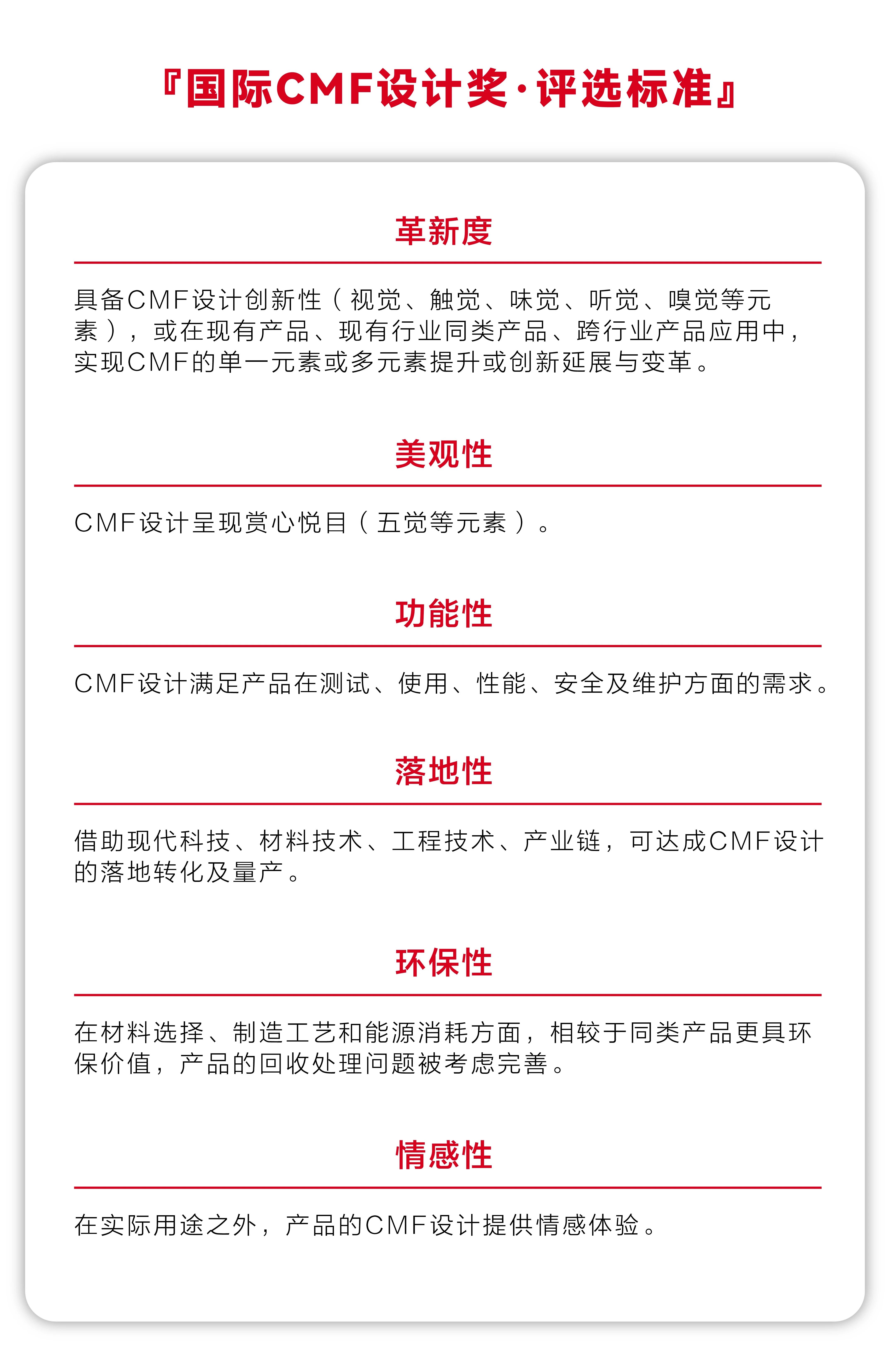 国际CMF设计奖 CMF DESIGN AWARD:是全球首个专注于CMF(色彩、材料、工艺、图纹)的专门奖项。旨在推动人们对CMF的认知,提高人们对CMF的认可与关注,共同思考CMF的创新价值、社会价值、人文价值、商业价值。