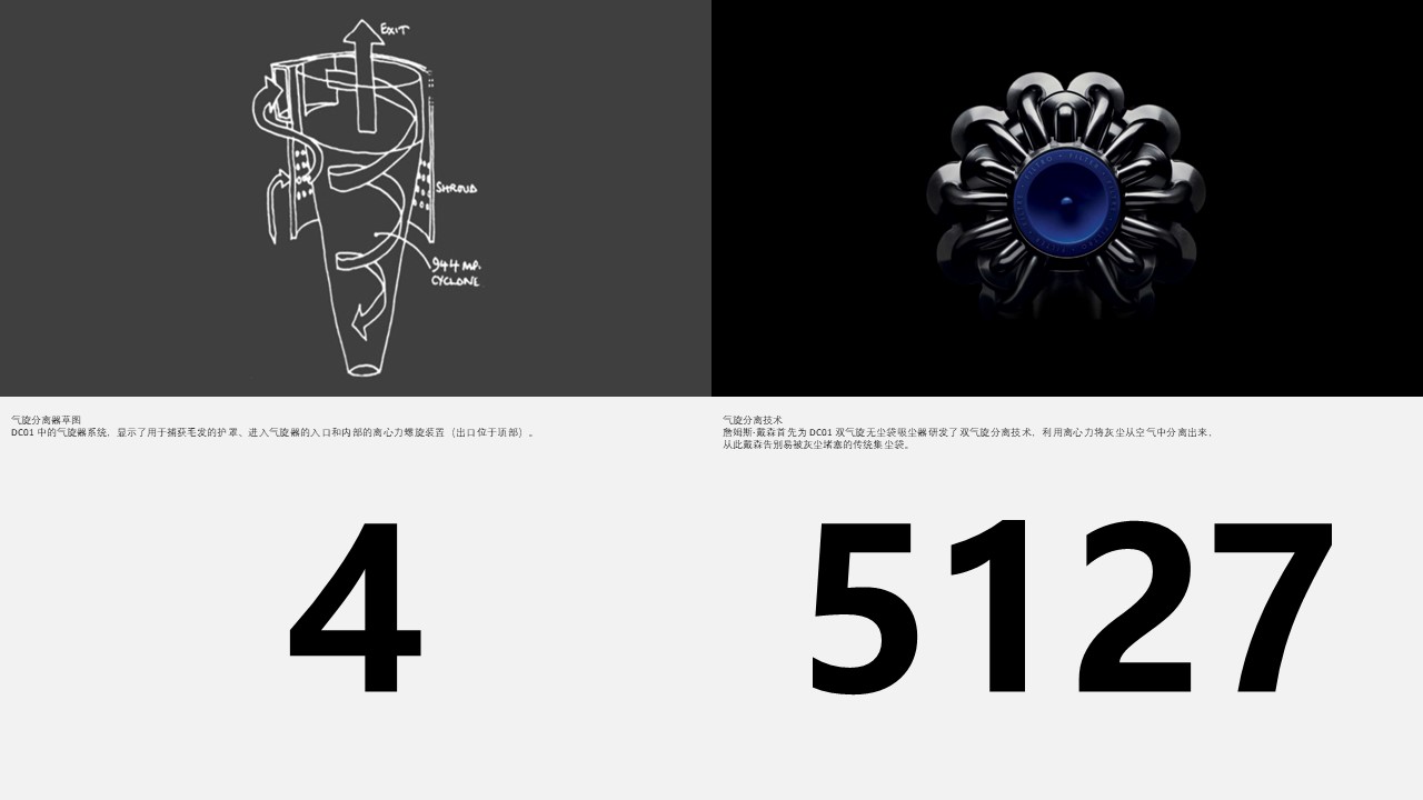 “1983年,经过4年的创造与测试,我设计的第5127个气旋吸尘器手工原型终于成功了。” 而这第5127个气旋吸尘器的核心技术,可以说是戴森产品的第一次“革命”,告别了当时竞品一直使用的“集尘袋”,同时可以使产品使用过程中吸力不衰减。