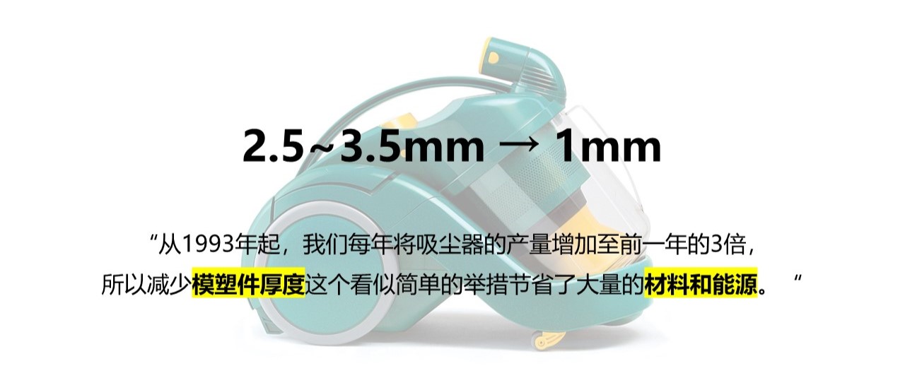 本着减轻吸尘器重量的出发点,以及节能、减少材料资源应用,他们挑战供应商经过计算后权衡出的厚度,最终设计并制作了1mm厚的透明集尘桶,同时经久耐用。“我们设立了一个大型的‘折磨流程’,用于测试我们的吸尘器...尽最大努力破坏或磨损它们...”对质量的严格控制使他们能够使用更少的材料,制造更轻盈的产品。