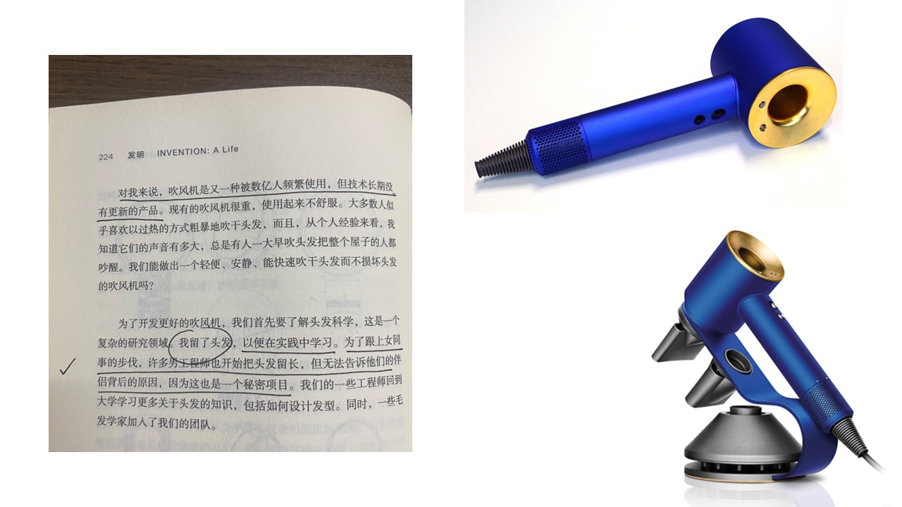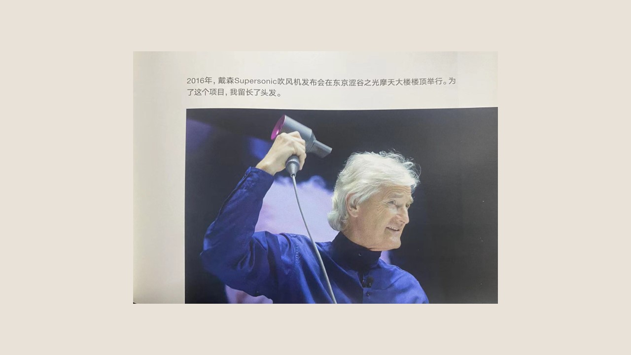 在开发戴森吹风机的时候,他以身作则留起了长头发,自己就是“试验品”,更惊讶的是团队很多男工程师也这样做,同时他们还研究了世界各地不同类型不同群体不同粗细的各种头发、发型等等。