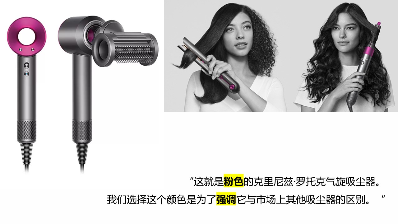 撞色设计一直是戴森的设计语言,有彩色和无彩色的对比、材质表面处理的对比、视觉重心的暗示强调,使戴森系产品在当时的竞品中脱颖而出,形成自己独有的高辨识度,强化品牌认知和形象。