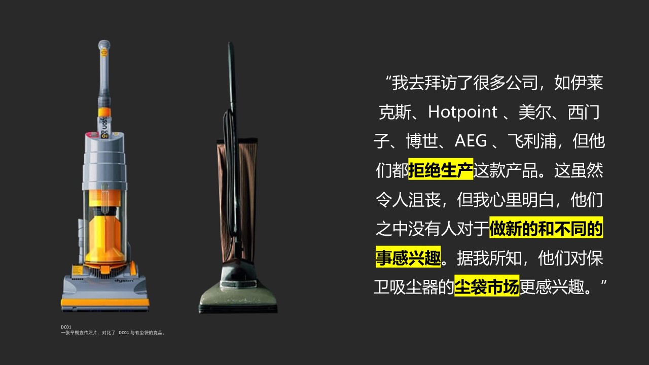 吸力不减弱的吸尘器当时还没有发明,同时尘袋更换业务利润丰厚,导致老牌电器公司似乎对新技术非常不感兴趣。没有外界的挑战,它们可以躺在功劳簿上睡大觉,至少当时是这样的。