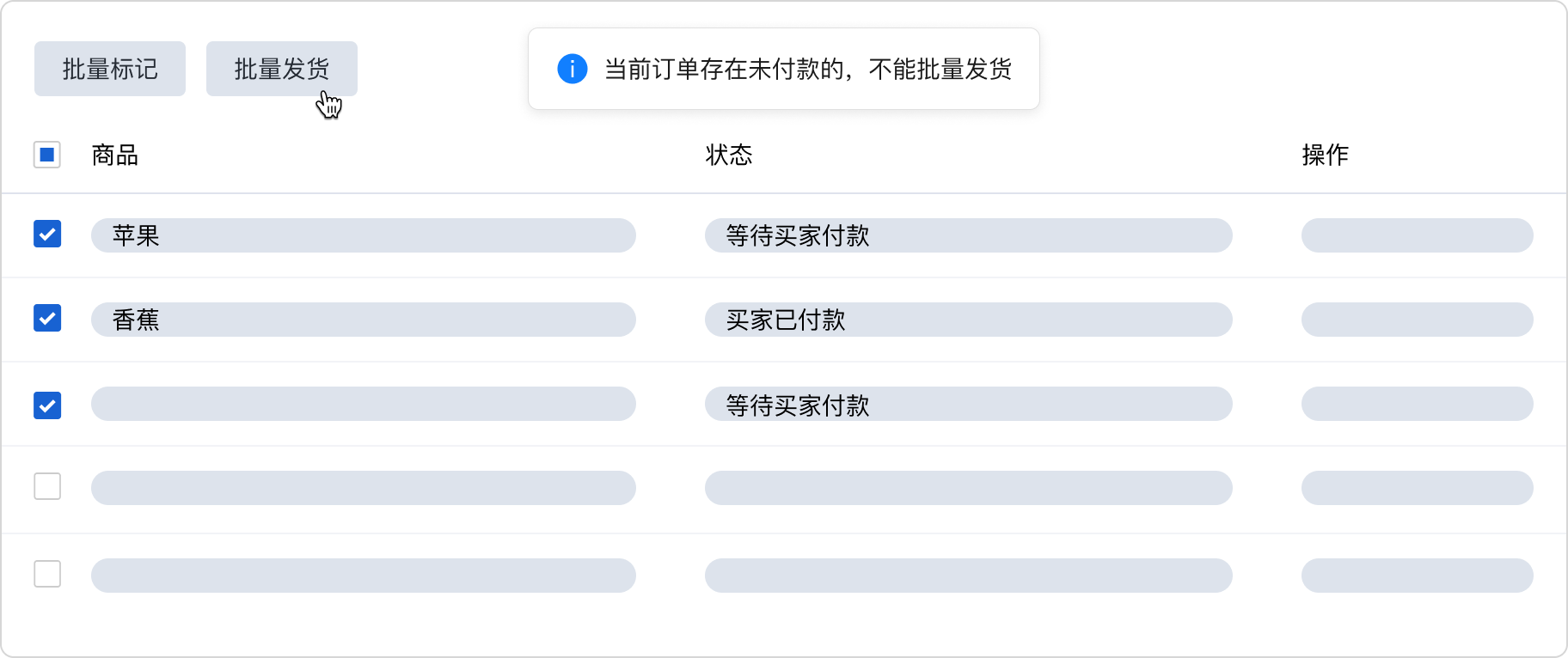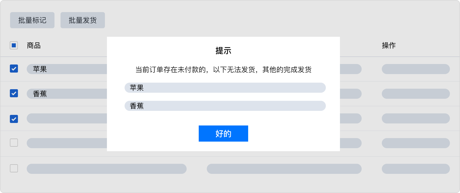 多选,点击批量发货,提示"xxx"无法发货,其他的完成发货