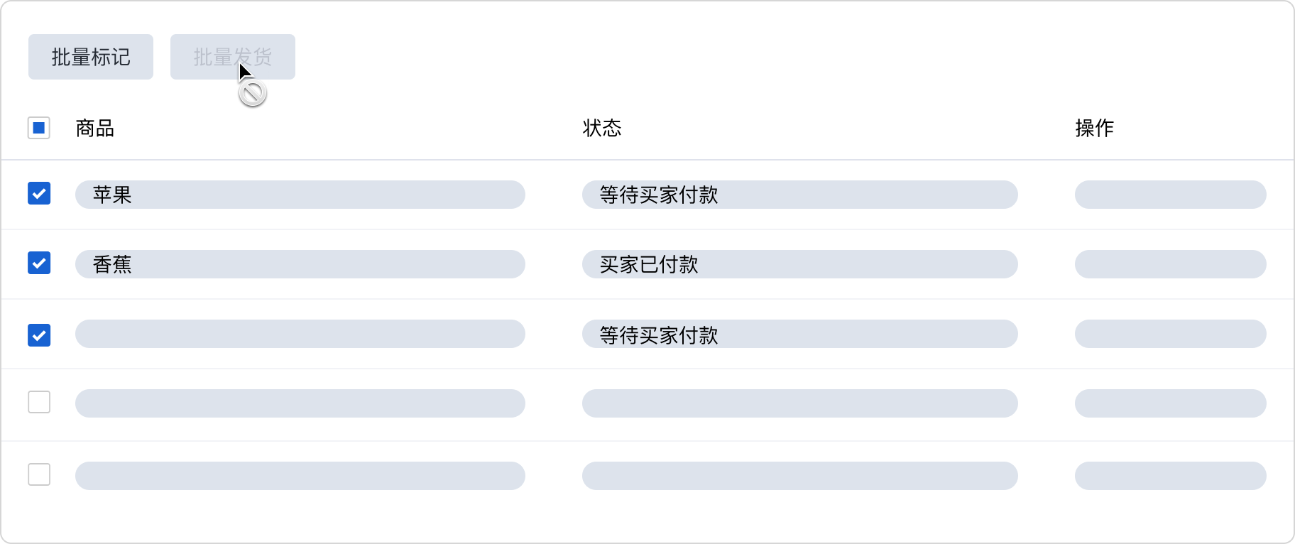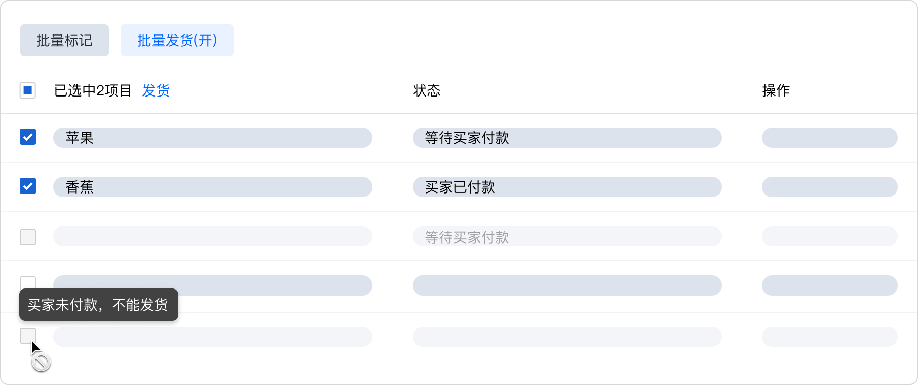 依旧是操作前不可预知,不能防错。如果有多个批量操作功能,点击复选框对应的按钮真是一闪一闪亮晶晶了。但是对比方案1,操作后能知道哪些不能发货、且少了点击操作按钮的一步。