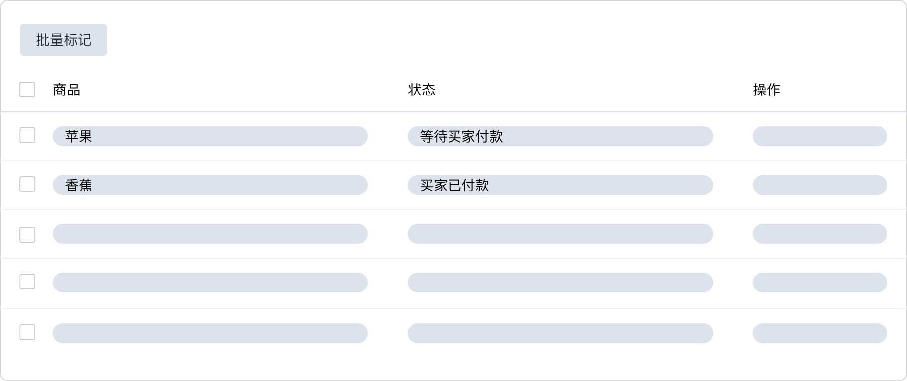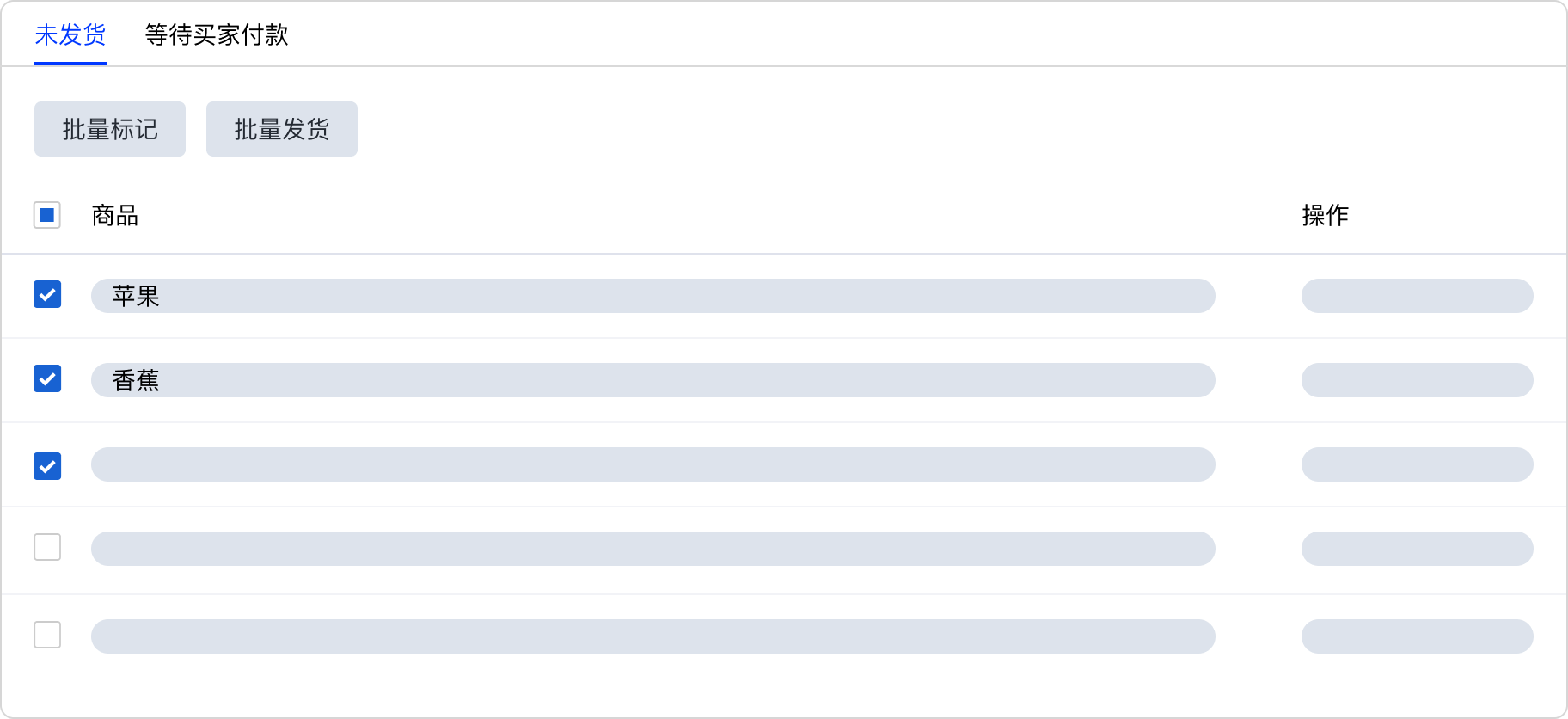 订单管理页,显而易见是管理,经常涉及批量操作。虽然现在只有批量标记功能,但是以后还会有很多批量功能出来。那么批量按钮适合常显(如下图的非模式批量操作),而不适合3.1.2的多选触发。