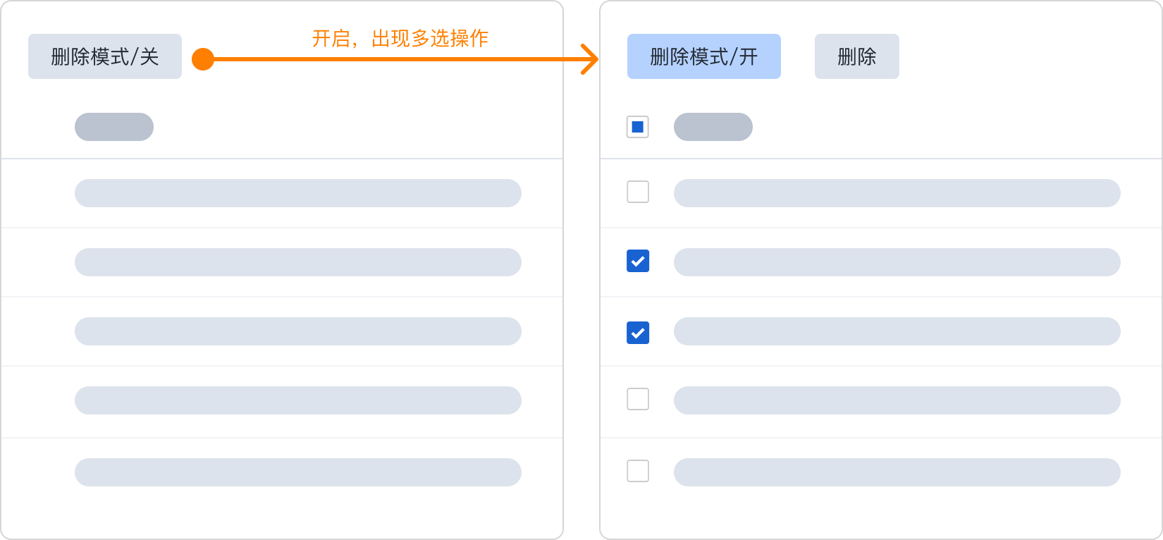 现在比较常见的设计。通过多选操作,预判了用户需要进入批量操作模式,比上面的方式少了一步。