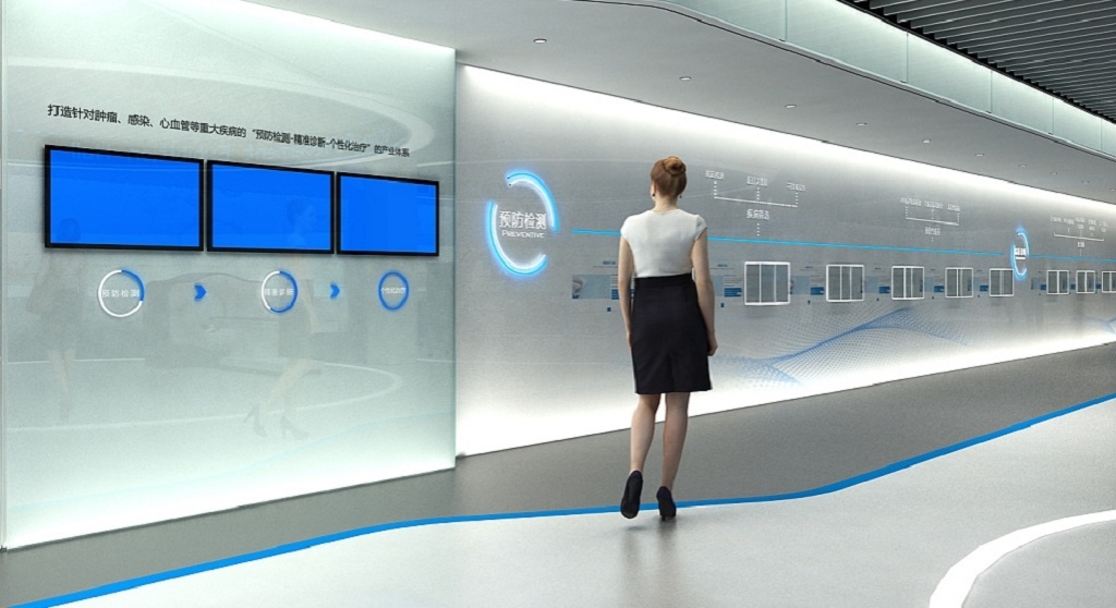 在生物展厅中其展示形式也影响着内容的输出效果,通过互动滑轨屏、全息投影等多媒体互动设备,丰富生物科技成果、产品、介绍等信息,将一些艰深晦涩的理论知识,通过动画、视频、动态图文等方式清晰呈现。因此,在生物科技展厅设计方案中,利用多媒体互动展项展示内容,具有明显的优势。