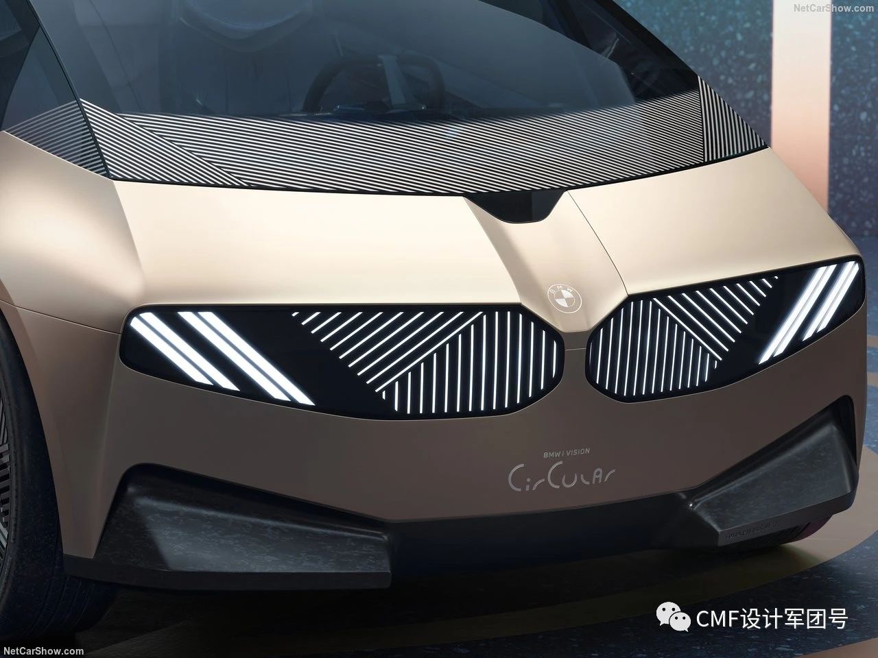 下面这款宝马i循环概念车采用了可回收铝材质打造,未喷漆,通过阳极氧化工艺实现浅金色。而车尾蓝紫色部分则是采用了热处理可回收再利用钢材料。
