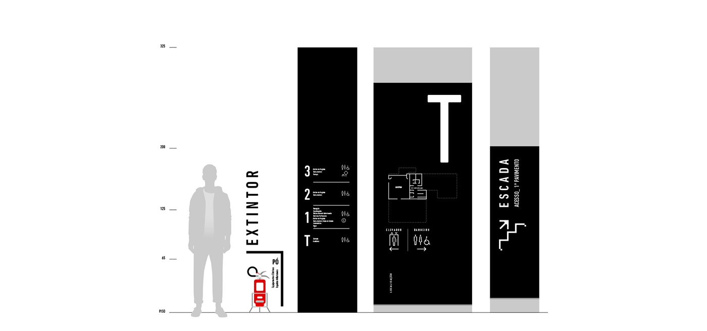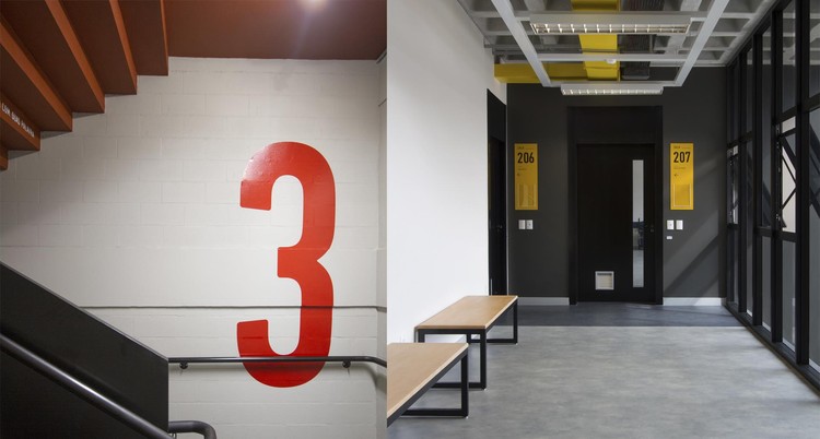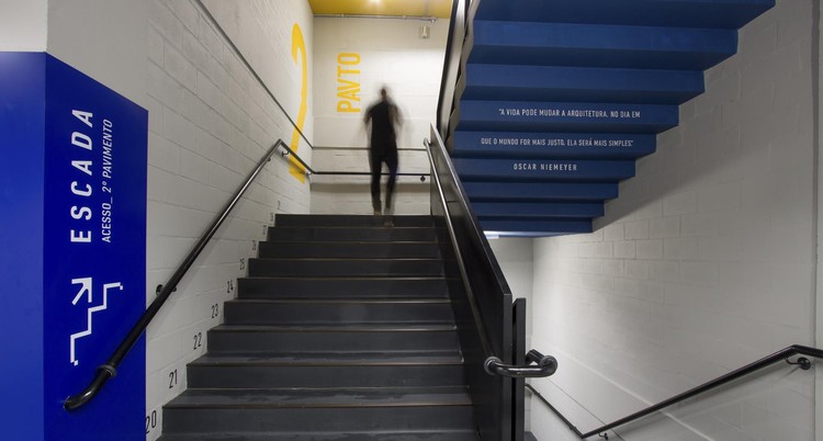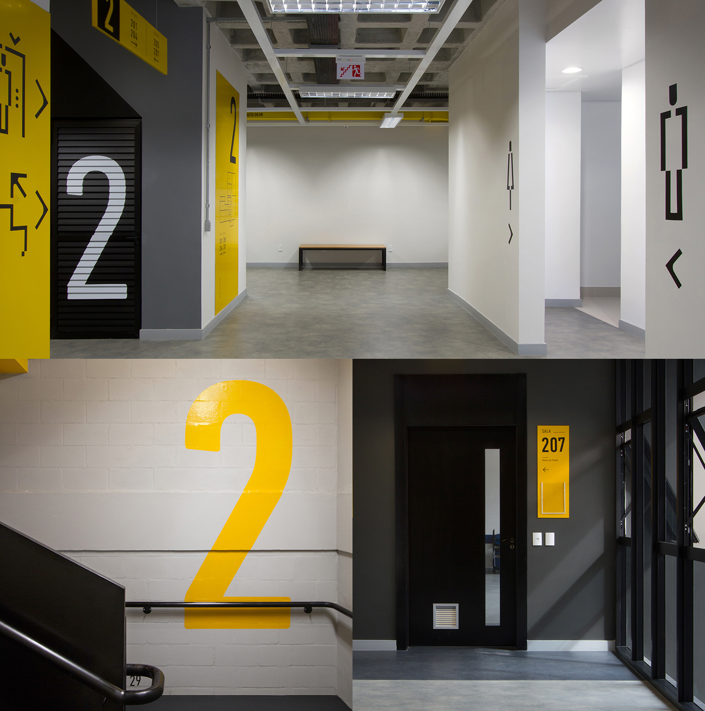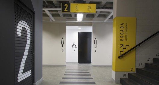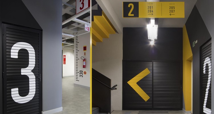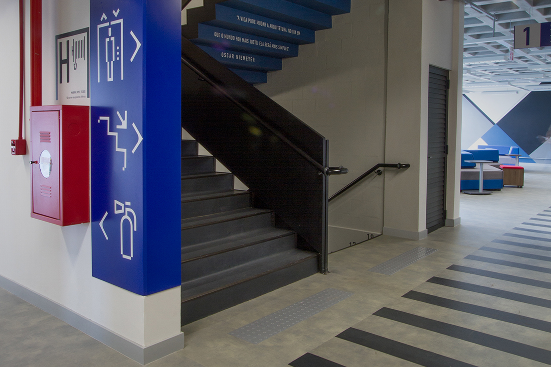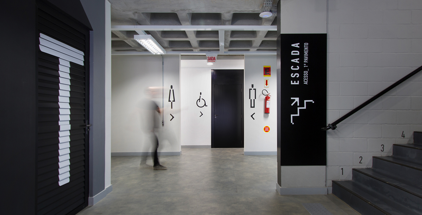 寻路目的是在标牌概念和建筑物的室内设计之间创造共生关系。为了消除架构和设计之间的界限,Firmorama工作室使用Unisociesc学院的品牌颜色,每层应用一种进行区域划分。标牌材料参考了该城市的工业特征,巨大的编码与空间相得益彰,整套导视系统与建筑融为一体。