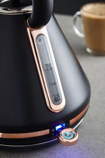 这款强大的快速沸腾 3kW 水壶采用金字塔式设计,带有黑色涂层和玫瑰金装饰,可更有效地冲泡热水,同时为您的厨房增添引人注目的色彩。1.7 升容量为单次灌装多达 7 个杯子,水位指示器窗口可让您查看剩余的内容物。具有 360 度底座和易于拉起的盖子,既实用又可靠。自动关闭和煮干保护功能可确保更高的安全性和安心性。过滤器可以快速拆卸,便于清洁。