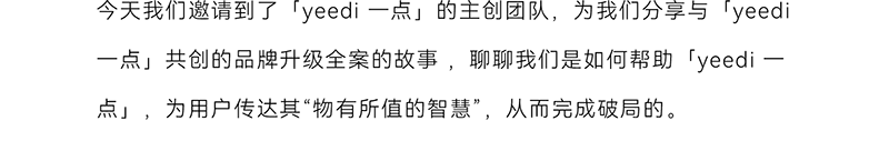 今天我们邀请到了「yeedi 一点」的主创团队,为我们分享与「yeedi 一点」共创的品牌升级全案的故事。