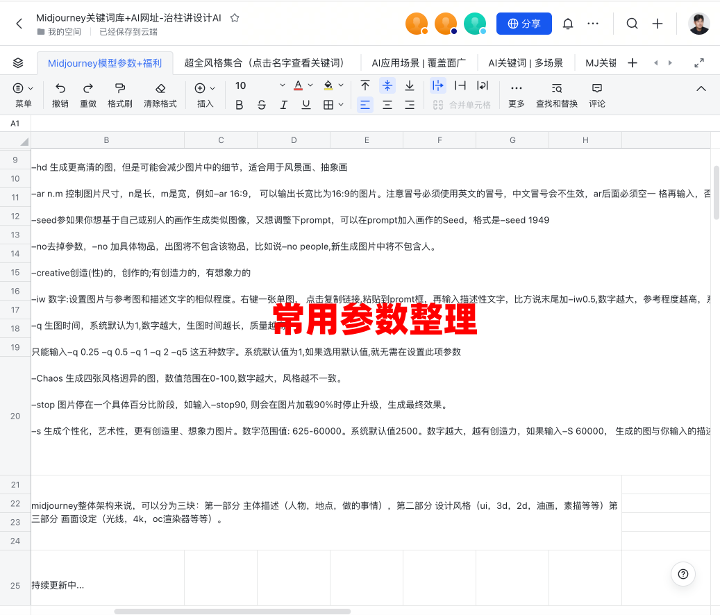 3.超全Prompt关键词库文档分享送给大家,包括风格+场景+命令+AI工具+参数等