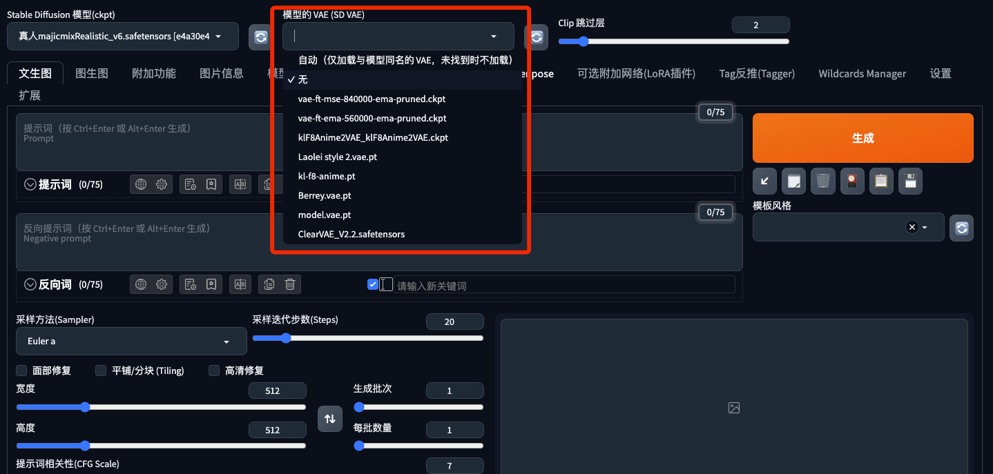 VAE代表变分自动编码器。它是神经网络模型的一部分,可在较小的潜在空间之间对图像进行编码和解码,从而使计算速度更快。 VAE类似滤镜,也可以理解为锐化,使用了可以增加画面的饱和程度,否则图像看起来有雾且不饱和。
