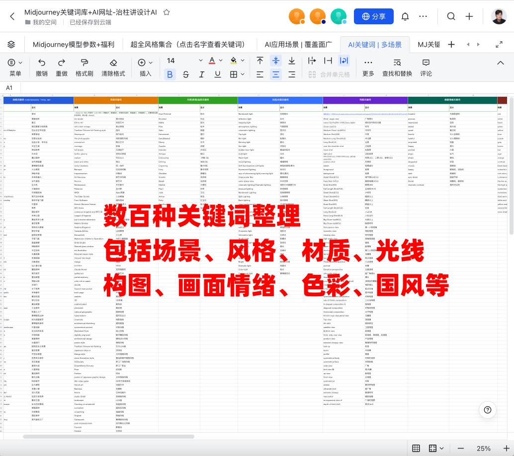 2-数百种关键词整理(包括场景、风格、材质、光线构图、画面情绪、色彩、国风等)、