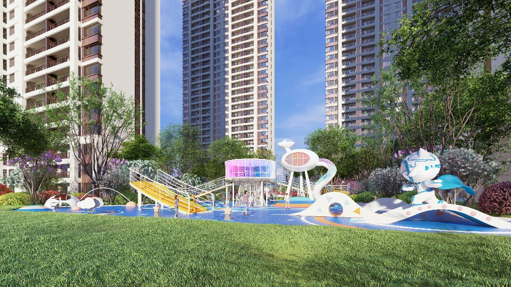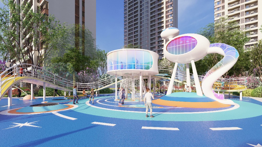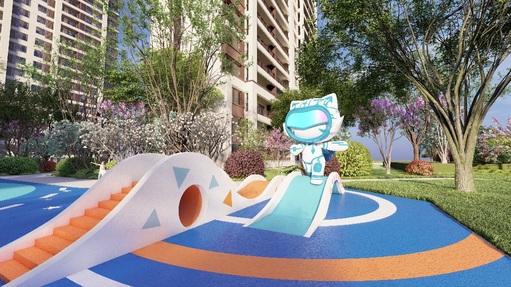 在西安保利·和光尘樾一案,迪安设计作为其一期、二期大区的景观设计方,创作期间,经历了生活方式的进阶、友好景观的进化、IP的创新与迭代,“我们希望以乐学、乐动、乐活为关键词,以小K的星际漫游为故事起点,营造玩趣无限的生活社区,带给小朋友、大朋友以高品质生活,温暖每个日常。”