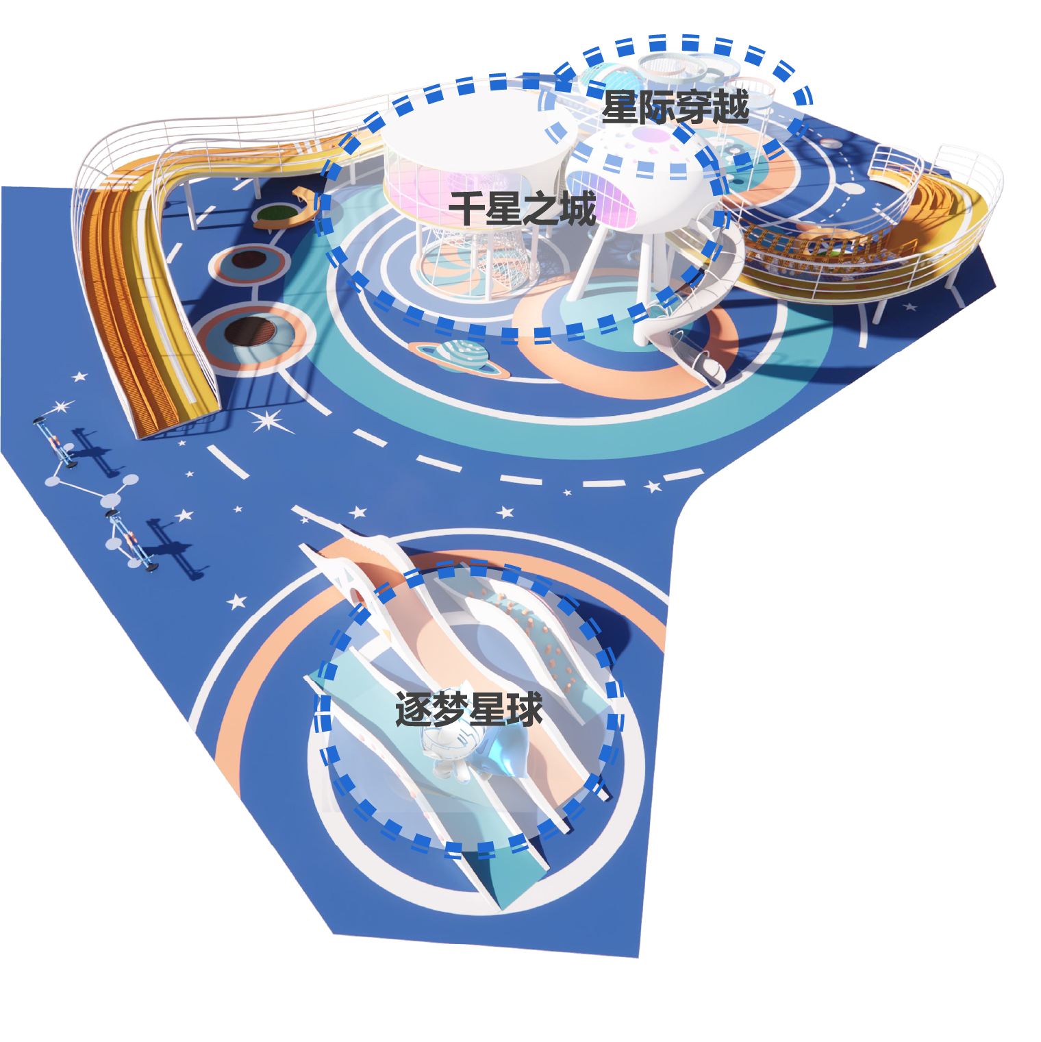 在IP主题下,每个场地、每个细节都在丰富星际叙事,展演极具未来感的探险奇遇篇章。以千星之城为据点,从时空隧道廊桥上逆风起航,去蹦蹦床探索与天空的距离,去传声筒把悄悄话说给风,去廊下荡秋千,在编织网攀爬,在云朵摇摇椅、星星跷跷板戏耍......设计丰富孩子们游玩体验的同时,顺沿探险的动线,打通各个关卡,描绘出乐园活动图鉴 —— 星际云端,共享科技与童话的想象力,大有可玩。