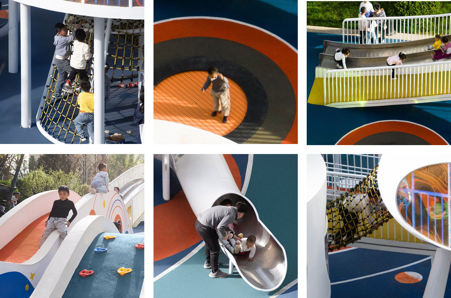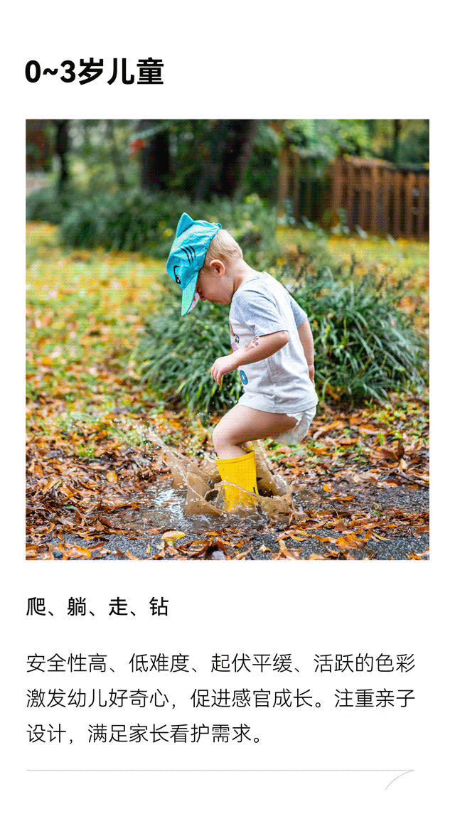 “婴幼儿更适合安全性高、难度较低的活动,爬缓坡、钻孔洞的设计给他们的引导;大一点的儿童开始有了和小朋友互动的意识,宽敞的场地更便于他们协作与跑跳活动;学龄儿童对世界的探索更为大胆,寓教于乐的滑梯、秋千、传声筒、捉迷藏等活动,更受他们偏爱。”
