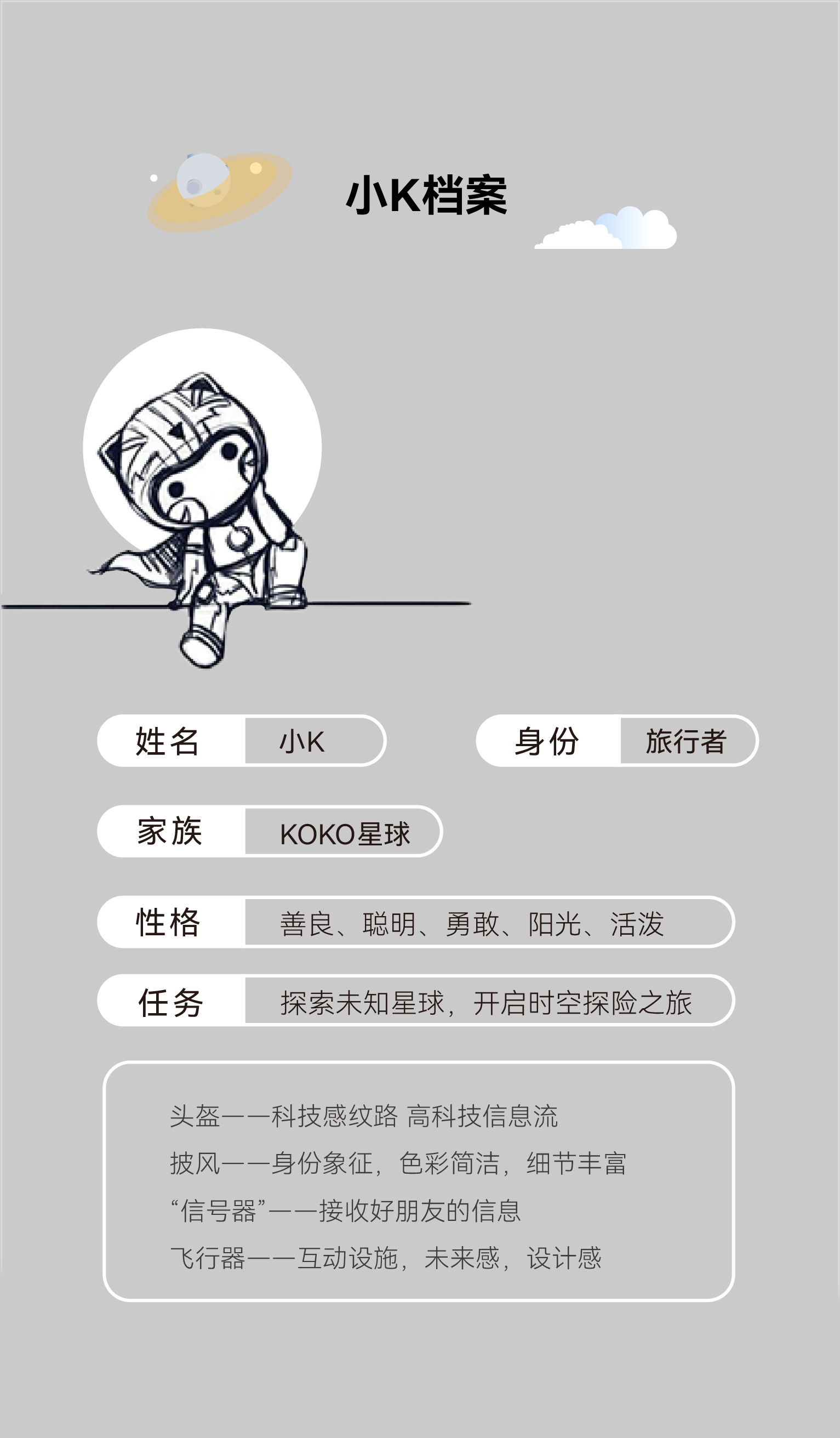 “小K的设定,契合星际乐园的故事线。作为孩子们那个来自未来的外太空朋友,我们寄托在小K身上的,不仅是充满未来感、科技感的潮酷造型,更希望找到一种轻松愉悦的方式,与不同年龄段的孩子们互动、交流,调动他们对外部世界的好奇心,开启智力与体力拓展的启蒙之旅。”设计师分享这一IP的创作思路时道。