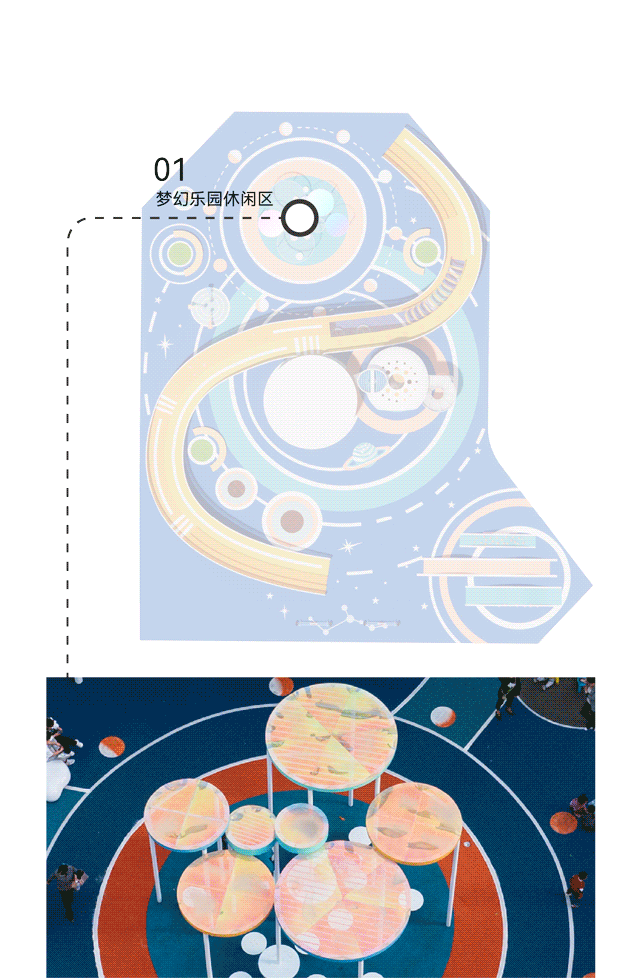 梦幻星球被设计师划进一个圆形区域,外环是橙色跑道,与相邻活动主题有效区分开来。荫凉之下,这里是小朋友的“充电站”,亦是长辈、家长等“大朋友”的休闲之地,以视线、听力范围内的近距离陪伴,即时关注着孩子成长每一步。