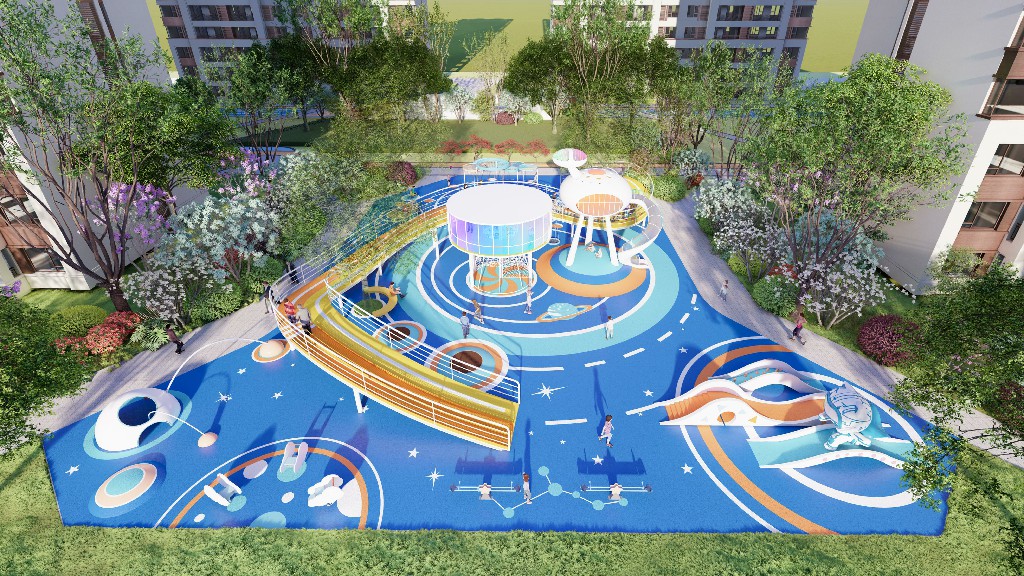 依托于场地现状,设计师以“时空漫游,星际逐梦”为创意发散点,于是星轨、银河、星球、空间站等意象走入现实,构成了社区里的奇遇发生地,孩子们随时可以开启一场穿梭未来的快乐冒险。