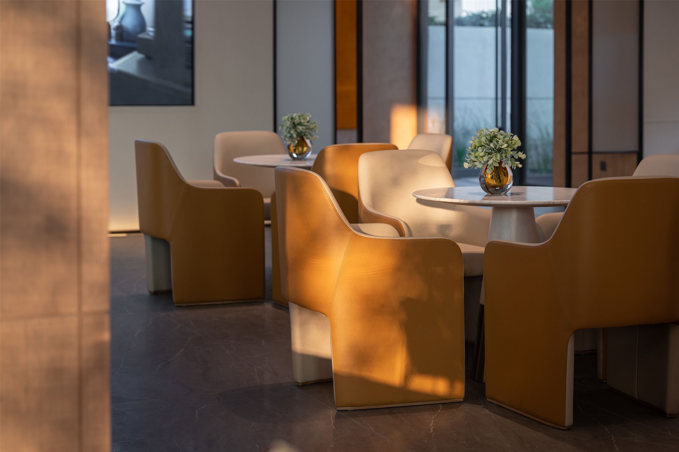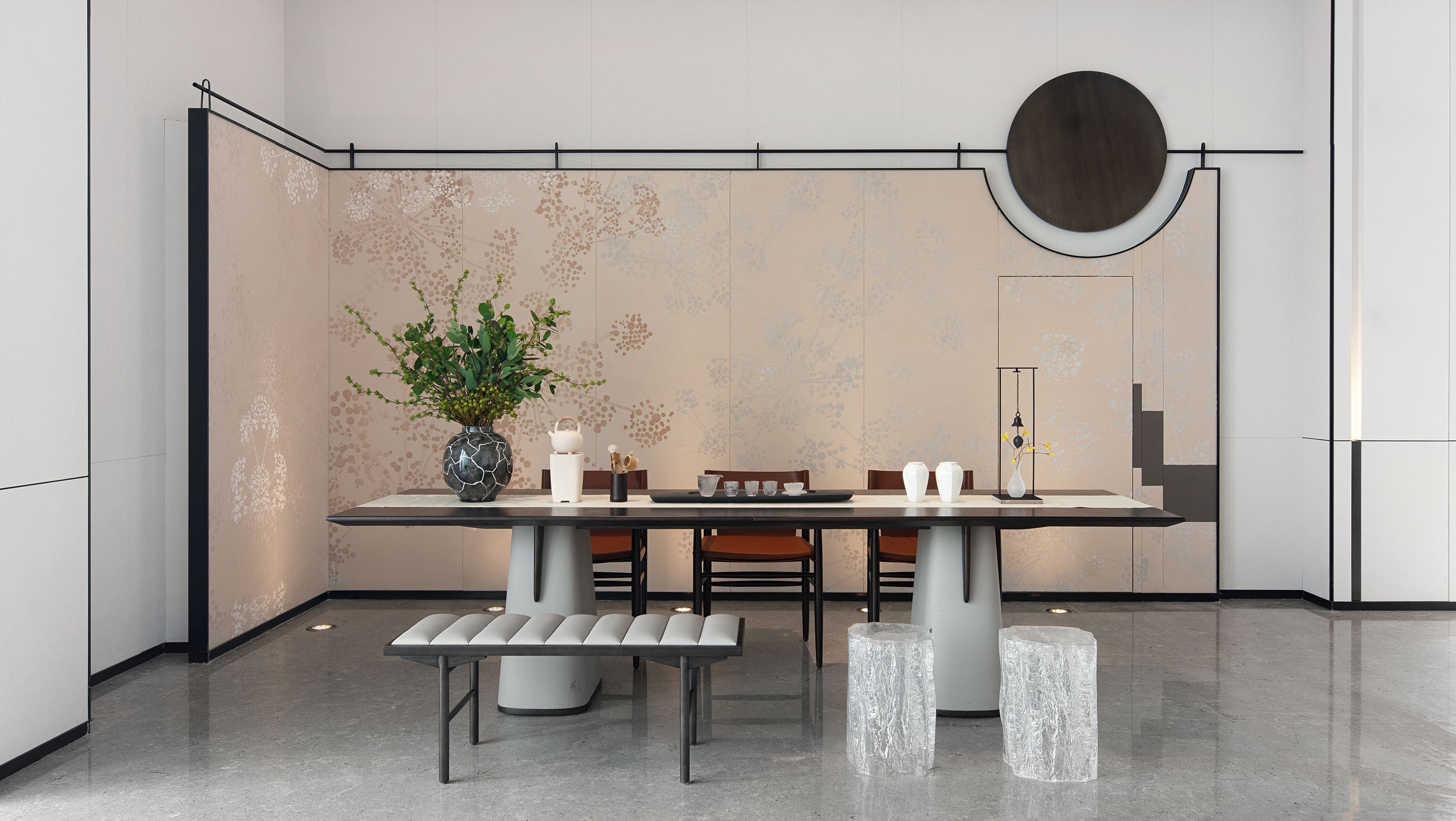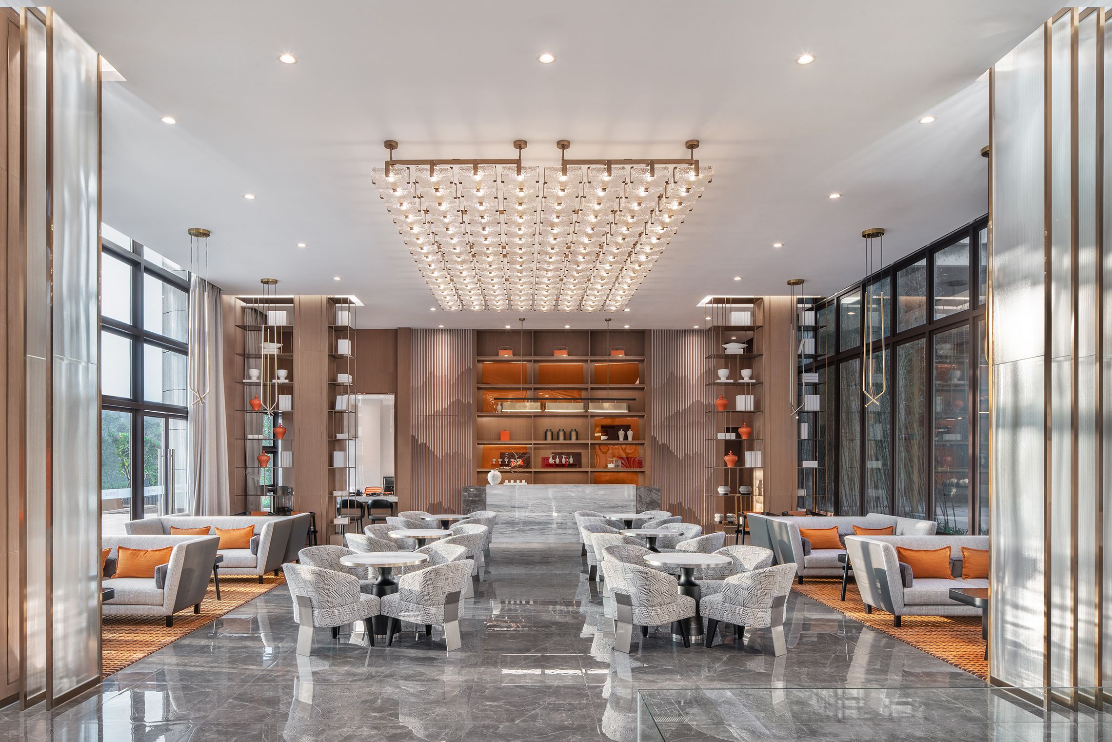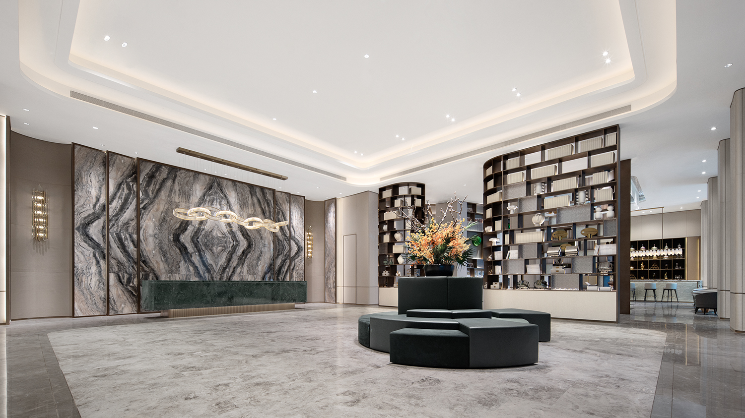 在“松下月圆,好事连连”的美好寓意中,YORO御融设计以橙画圆,将橙之形与彩结合现代美学,以橙定彩,显活力、富足,为空间氛围续写圆满和乐。空间动线以镜、花、水、月、人文、趣的故事串联空间,移步异景,传承东方礼序,打造游园式情景体验。