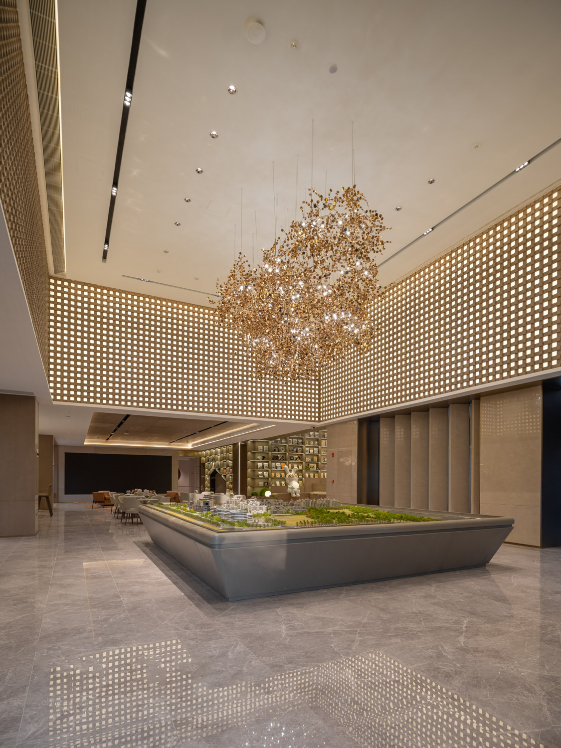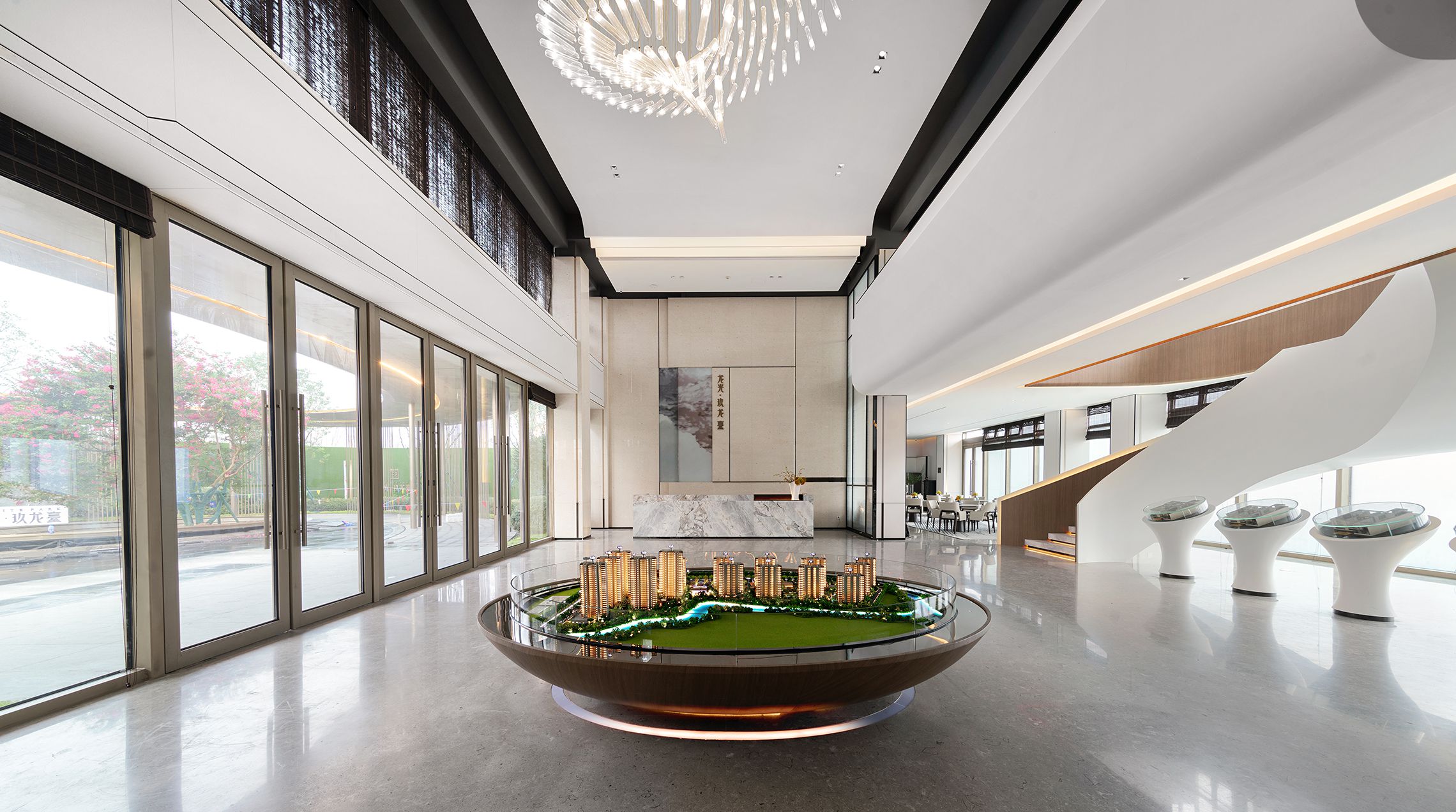 秉承“自然、东方、雅致、韵味”的设计感觉,YORO御融设计让亘古绵延的东方情怀,生长于空间,把浪漫的中式韵味和人文内涵打磨成城市新名片。从大厅到沙盘区,有种从古到今的穿越感,微缩形态的古代建筑和现代高楼,隐喻历史和现代的同框,表达人文与发展的协同。