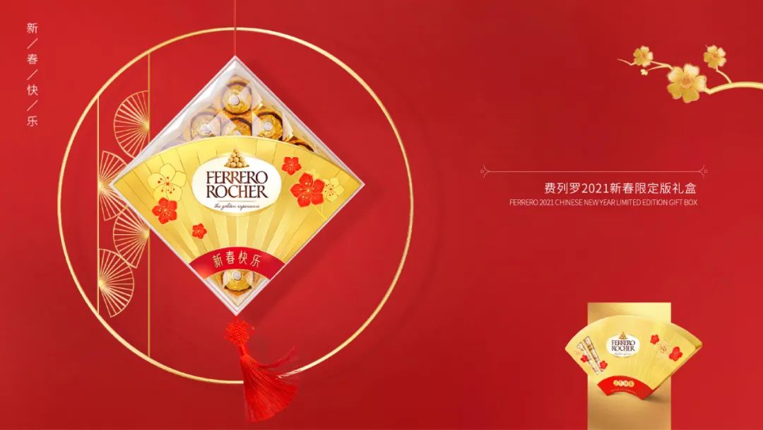 金与红的碰撞带来视觉冲击力与货架表现力,而上半部分费列罗金球praline自然露出,引发了消费者对品牌与节日场景使用的直观联想。