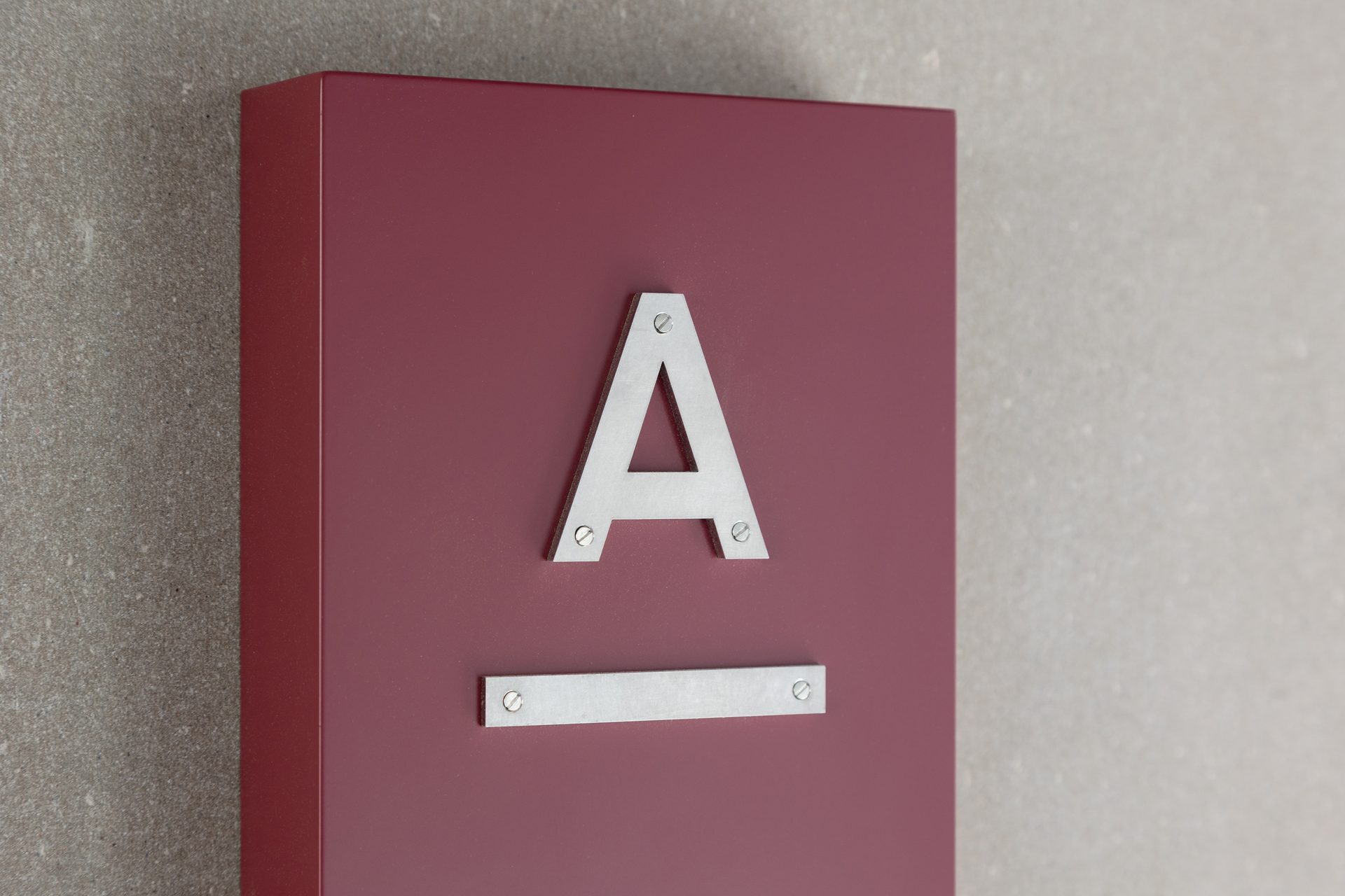基于Grove办公楼工业风的建筑风格,色部设计研究所将螺丝作为设计亮点,螺丝既有装饰作用,同时也起到固定剪下的字母和边框的作用。酒红色的标牌面板与建筑柱子的颜色相匹配,信息使用不锈钢材质,与等值材质相同,整套导视系统具有高度一致的视觉性。