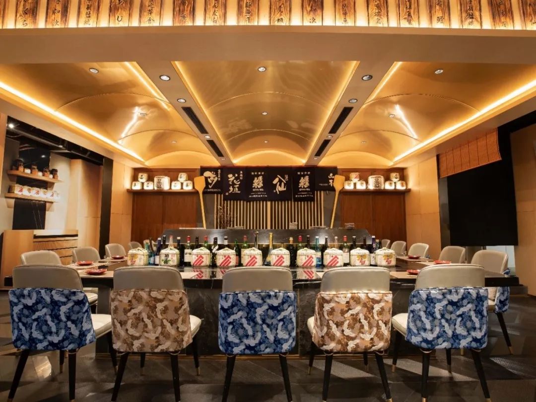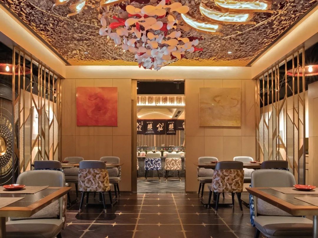 整间餐厅犹如一个大的庭园,打从店面开始已自然地吸引食客驻足欣赏,店面的设计以「竹林」及「枯山水」为主,利用可改变角度的钢条营造出竹林似的屏风,而可转动的钢屏风是由多个不同长短的立体牌子组合而成,安装后由人手逐一调教角度组合成一个大形的图案。凹凸起伏的墙身上更营造出水面波浪形的效果,加上特色油漆及灯光打造出河川似的水流,再配合接待柜台凹凸不平的原石材及接待处墙身由竹纹压出来的墙身设计,以枯山水的设计作为庭园的序幕。让客人像经过日式庭园和竹林,更新了感觉后才迎接新一程刺激视觉与味觉之旅。
