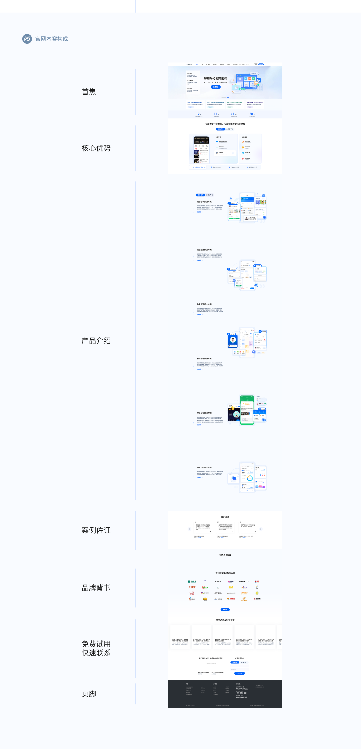 1.官方网站的内容结构包括以下几个部分:导航栏、首页焦点区、核心优势展示、产品介绍、业务数据统计、案例证明、售后服务介绍、品牌背书、免费试用/快速联系以及页脚部分。